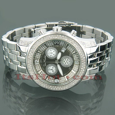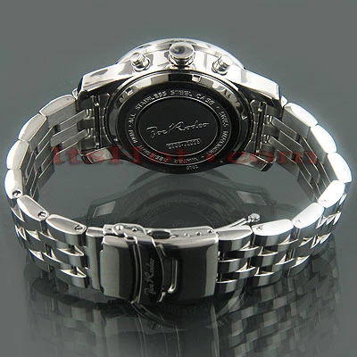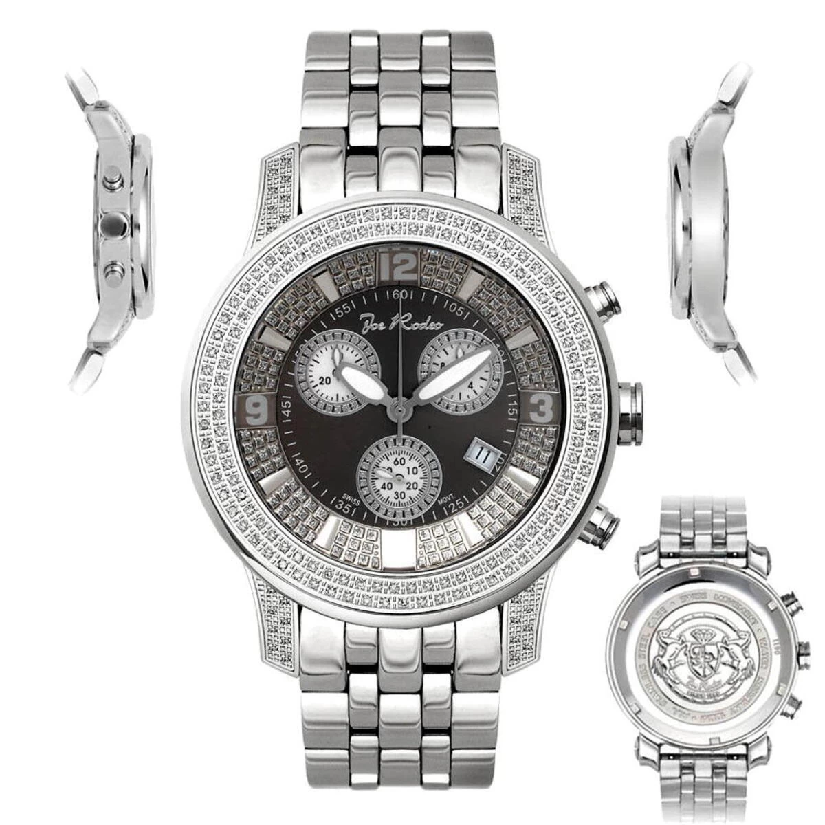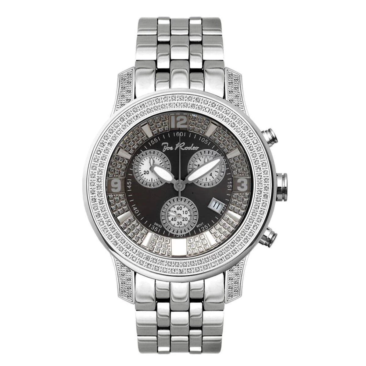 This Men’s JoJo Joe Rodeo Diamond Watch (Tyler) features 1.50 carats of genuine diamonds masterfully set on the bezel and lugs of its silver stainless steel case. The stainless steel face has three mother of pearl chronograph subdials and date display window at 4 o’clock position. This Joe Rodeo watches collection piece comes with a fine Swiss-made quartz movement with chronograph function, center second and date. Water-resistant to 100 meters. This JoJo diamond watch by Joe Rodeo comes with two interchangeable straps in different colors. The patented strap adjusts once for a perfect fit, and comes on and off with the press of a button.