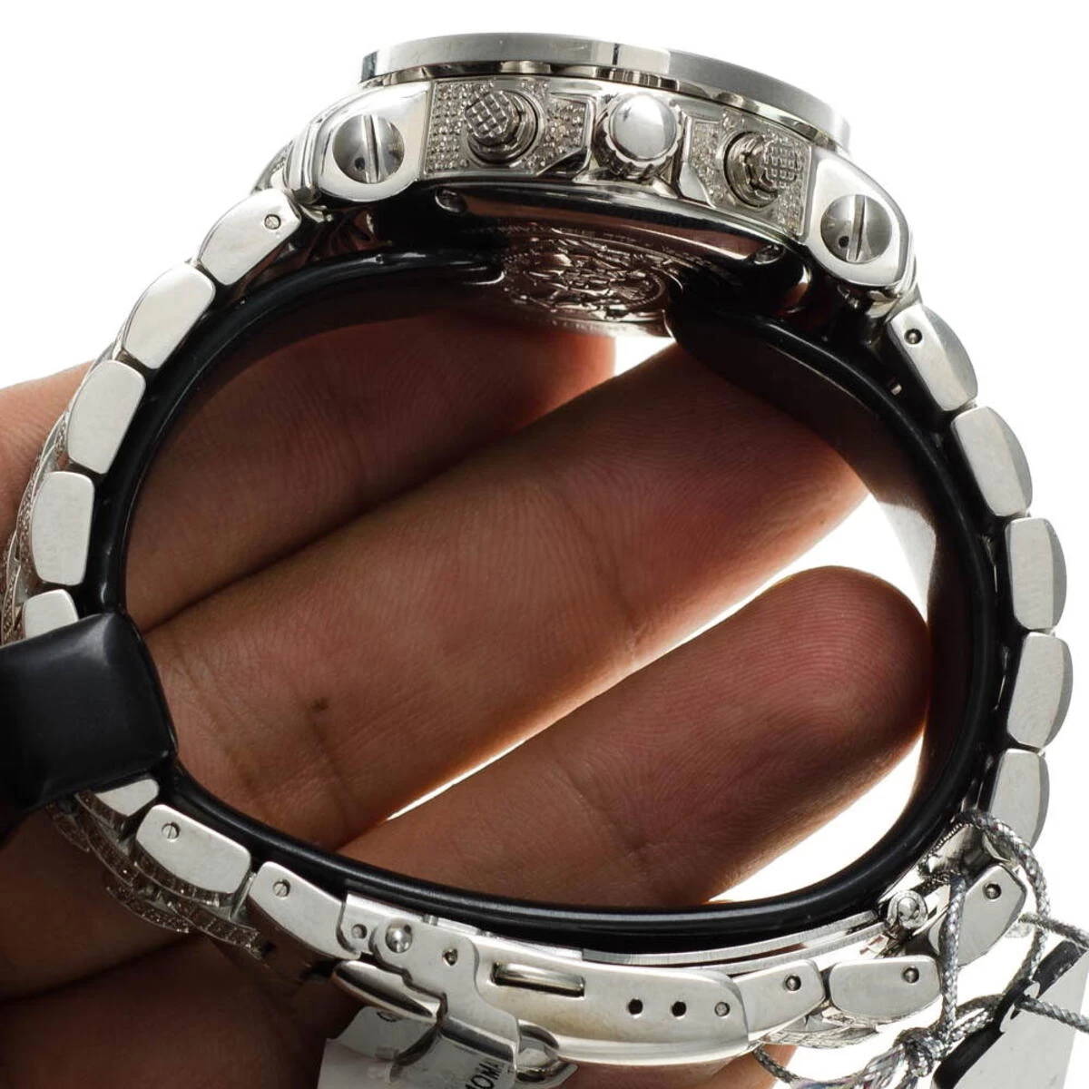 This JoJo Joe Rodeo Ladies Diamond Watch has a row of clear diamonds masterfully set around its bezel, lugs and the fully iced out band totaling 9.50 ct. The face of this diamond JoJo watch has three mother of pearl chronograph subdials and a date display window at 4 o’clock position. The watch is 10 ATM (100 meters/330 ft) water-resistant stainless steel case houses a very accurate Swiss-made quartz movement with chronograph function, center second and date. This women’s diamond watch by Joe Rodeo watches comes with two extra interchangeable straps in different colors. The patented strap adjusts once for a perfect fit, and comes on and off with the press of a button.