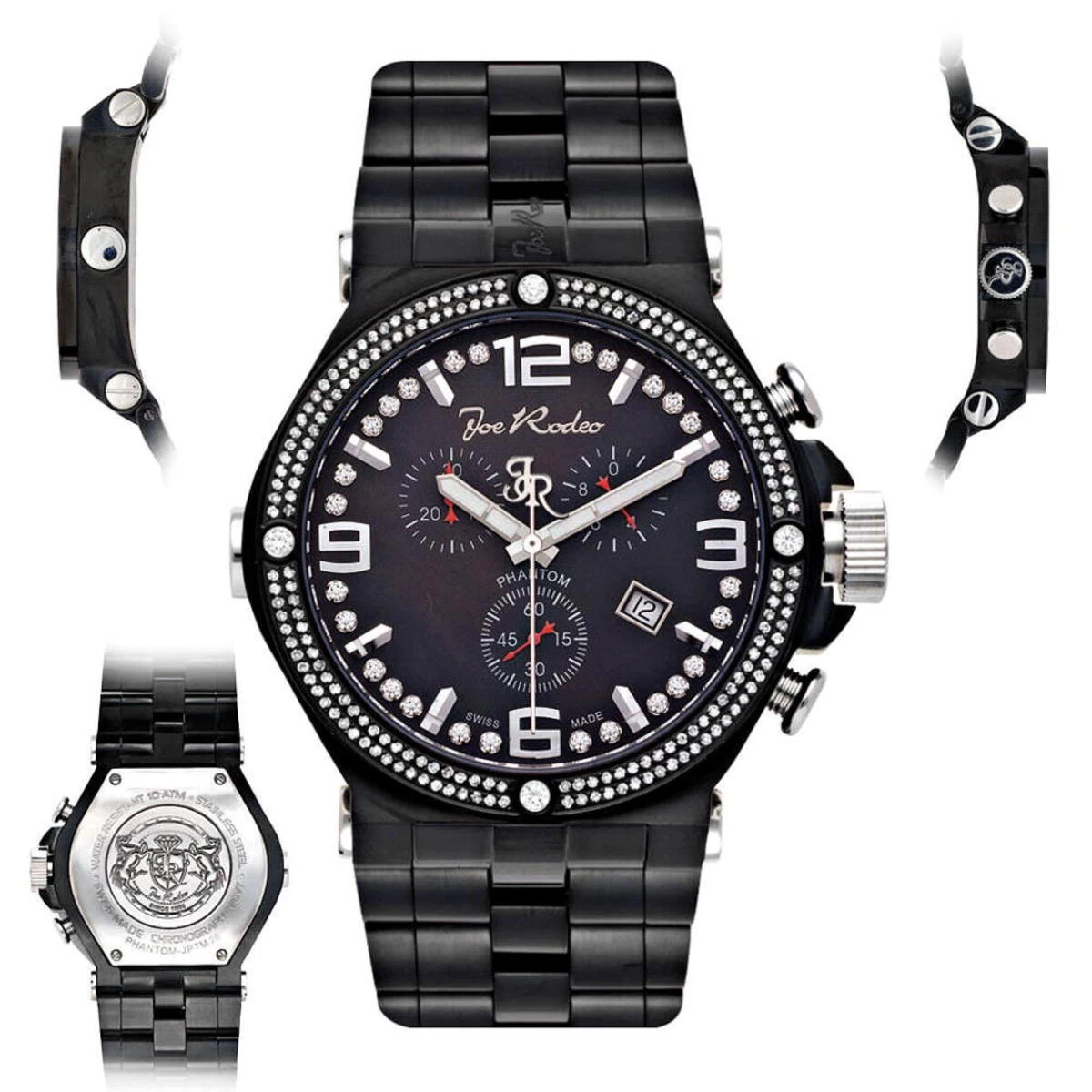 This JoJo Joe Rodeo Phantom Men’s Diamond Watch features 2.25 carats of round diamonds, a black stainless steel case, scratch-free crystal glass and black stainless steel band. This men’s diamond watch has two rows of white sparkling diamonds around the bezel. This watch by Joe Rodeo also features a black Stainless Steel dial with Silver tone hour markers and a row of sparkling white stones around it. Super accurate Swiss-made quartz movement with chronograph function will keep the time for you. Water-resistant 100m (330 ft).