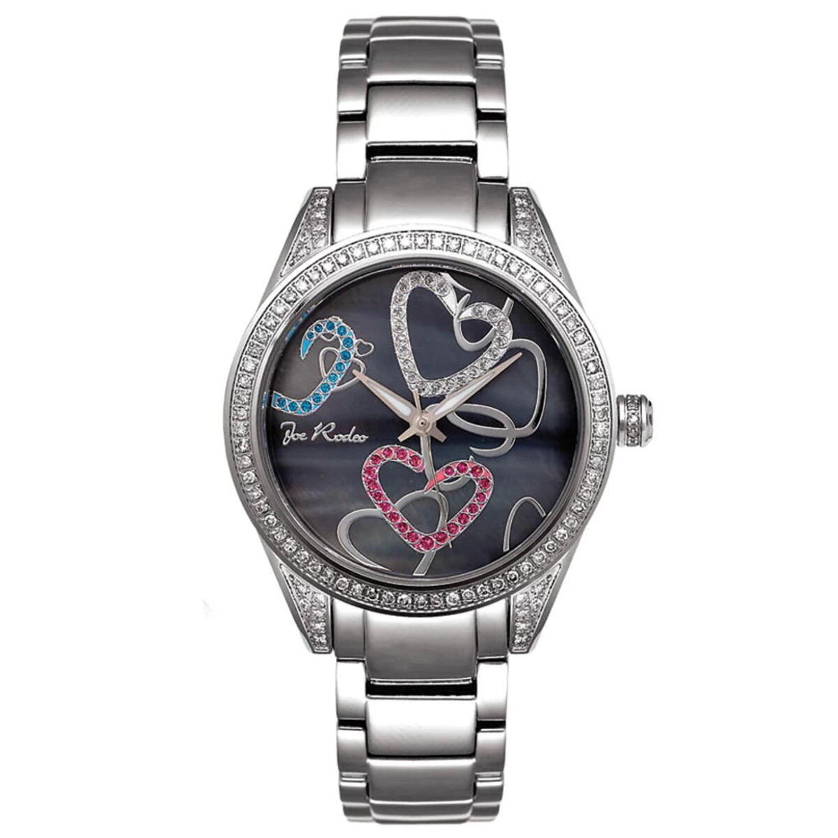 Luxurious JoJo Ladies Watches! This Joe Rodeo Diamond Heart Watch features 1.60 carats of white diamonds masterfully set on the bezel, lugs and on its crown. The watch showcases a 10 ATM (100 meters/330 ft) water-resistant silver stainless steel case that houses a very accurate Swiss-made quartz movement. This Joe Rodeo women’s diamond watch comes with two extra interchangeable watch straps in different colors. The patented strap adjusts once for a perfect fit, and comes on and off with the press of a button.