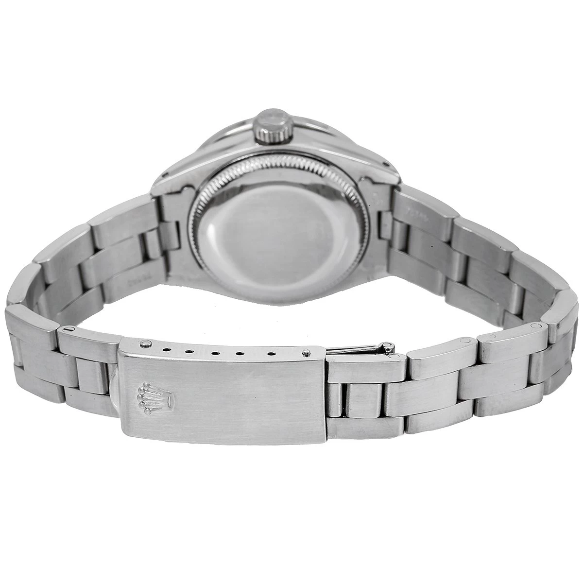 From our exquisite lady’s diamond watches collection: This Rolex Oyster Perpetual Datejust 6916 26mm Pink Diamond Dial and Bezel Watch watch is simply irresistible! Its vibrant purple dial will make each day more bright and positive even for the most sophisticated ladies. This debonair timepiece is featuring a shiny stainless steel Oyster bracelet, a beautiful bezel encrusted with white round diamonds creating a scintillating circle around the remarkable heart of a watch – it’s the dial. The bright purple dial is showcasing sparkling diamond hour markers and a date display at the 3 o’clock position. This lady’s diamond Rolex watch features 0.9 carats of genuine diamonds and is conveniently water resistant to 30 meters (100ft). Please note: this lady’s Rolex watch is pre-owned, in excellent condition, and comes in an original box with a 5-year warranty from ItsHot.com.