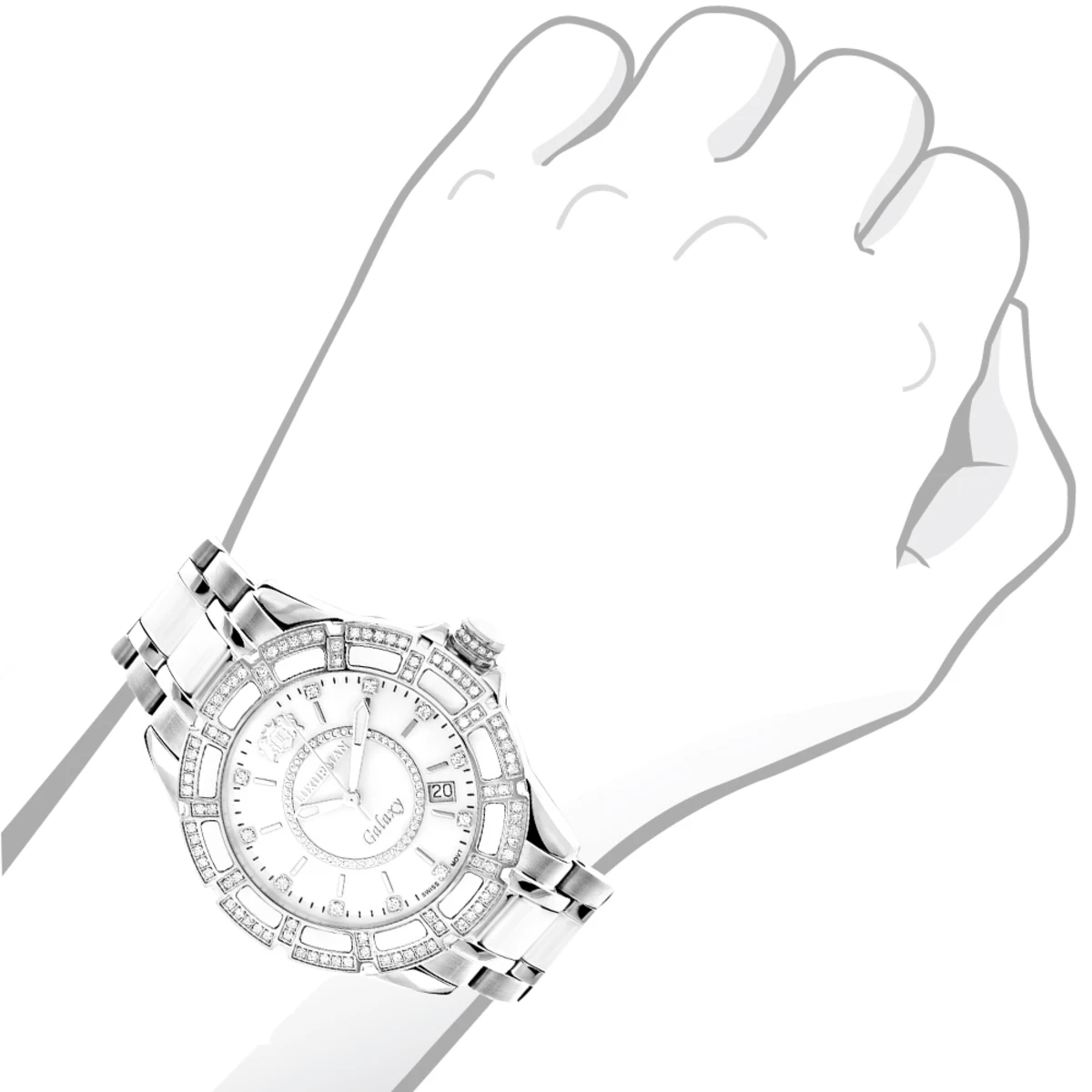 Ladies Diamond Watches: Luxurman White Ceramic Watch 1.25ct White MOP Galaxy features a crisp white style that is ideal for any season. Its white ceramic and stainless steel bracelet-style band and a subtle window at the four o’clock position presents the date. The dial and bezel are also white, and metal-toned numeric hour markers and luminous hands contrast while keeping the look light . With a durable mineral crystal, Swiss quartz movement, and water-resistance to 110 feet (30 meters). A stunning jewelry-inspired bracelet completes the look.