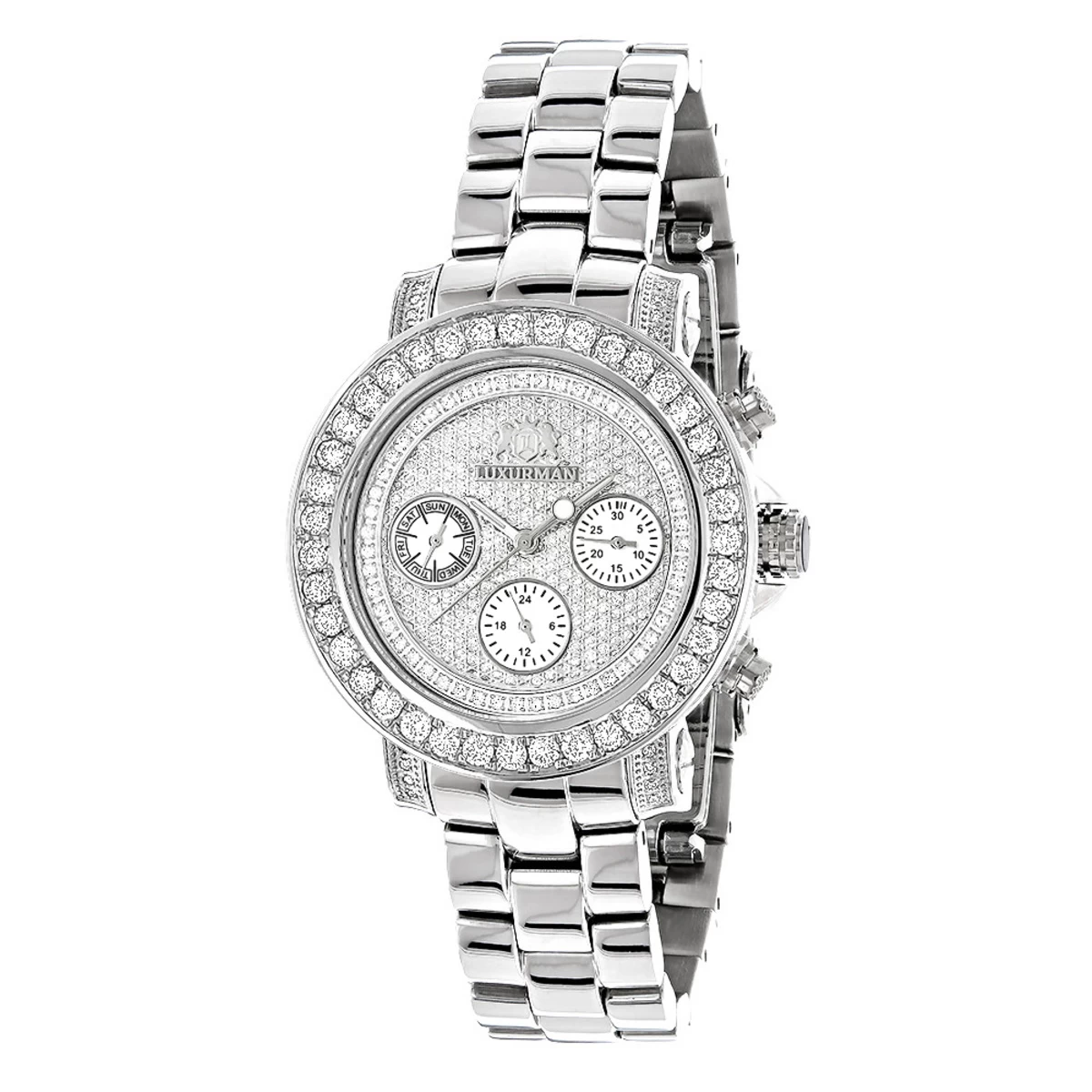 This Ladies Diamond Watch by Luxurman features 3 carats of genuine diamonds of the silver tone stainless steel case. The stainless steel dial has three subdials and is paved in white stones. This Luxurman diamond watch comes with two extra interchangeable leather straps in different colors and features a Japan movement. This ladies Diamond watch makes a perfect present for any occasion.