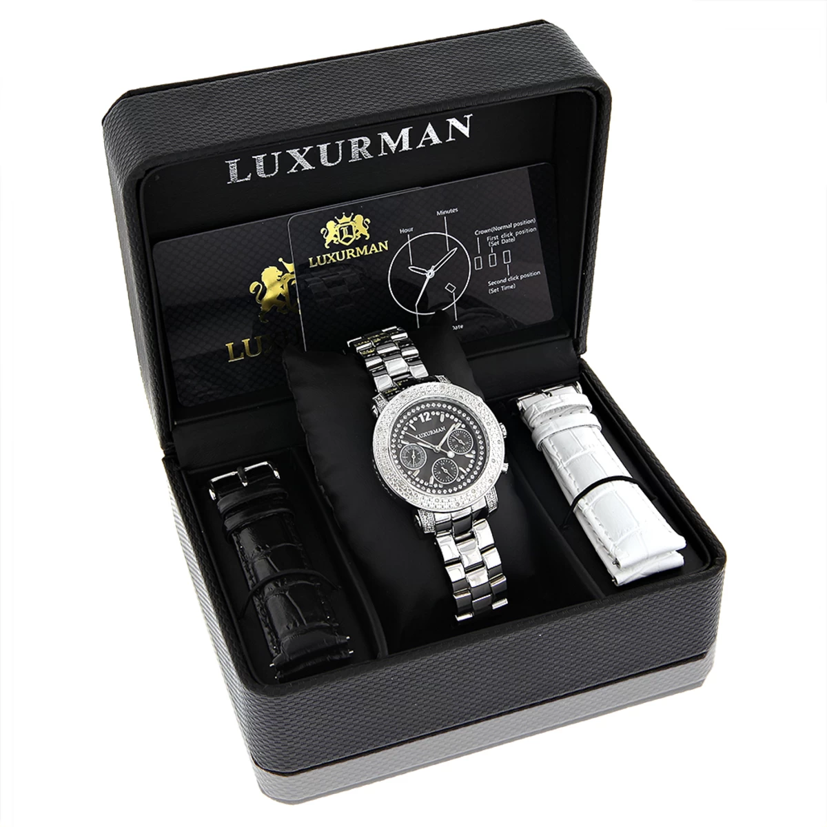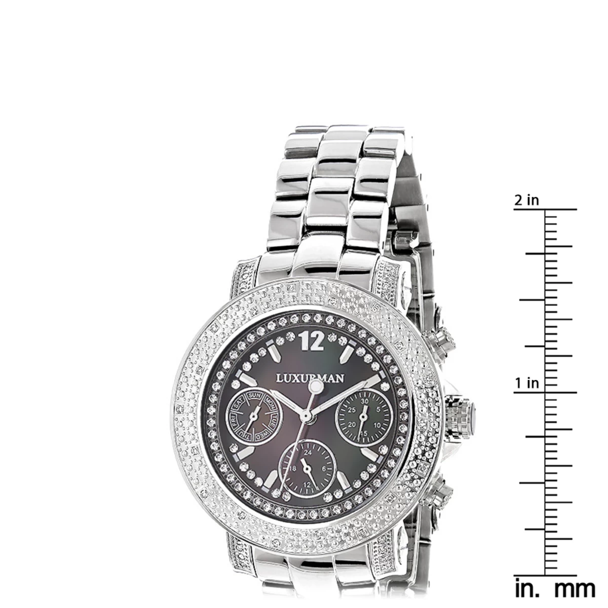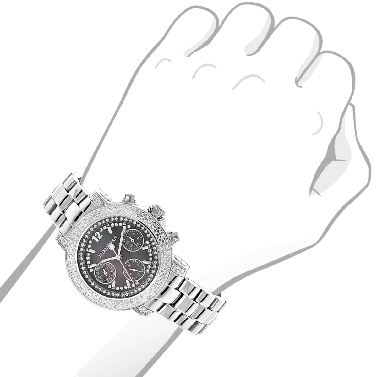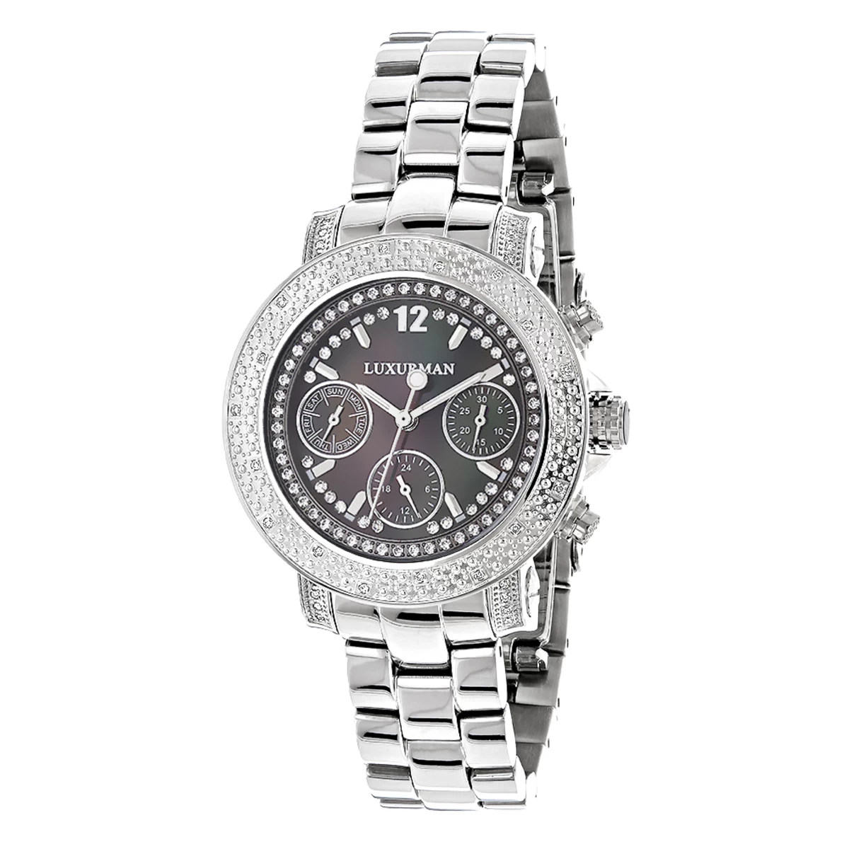 This Ladies Genuine Diamond Watch by LUXURMAN showcases 0.3 carats of sparkling white diamonds and black MOP face. This Luxurman diamond watch features a black dial paved in sparkling stones with three subdials, a silver tone stainless steel case and a polished silver tone stainless steel band. This Ladies diamond wrist watch by LUXURMAN houses a fine Japan-made quartz movement, and is conveniently water-resistant.
