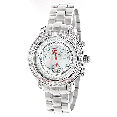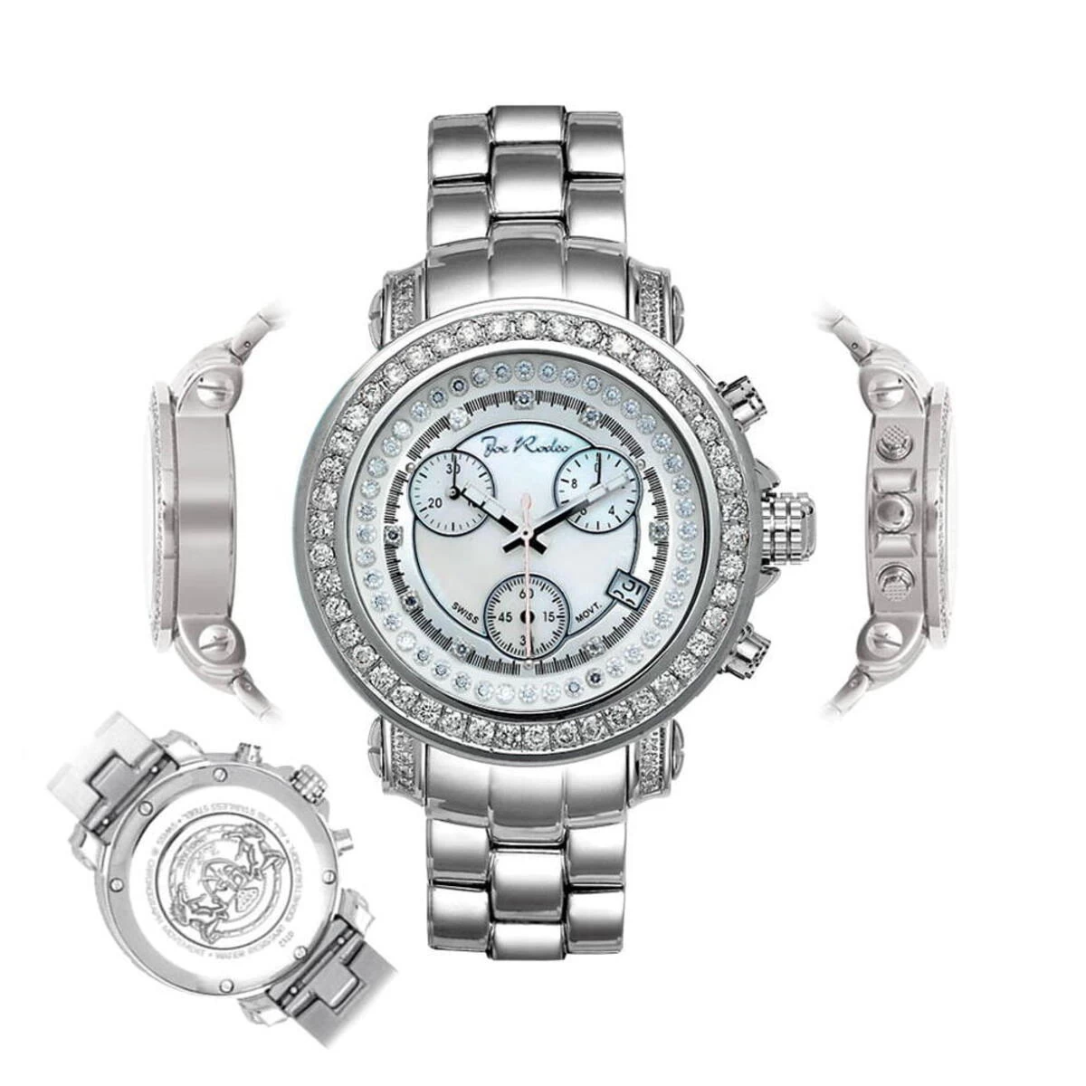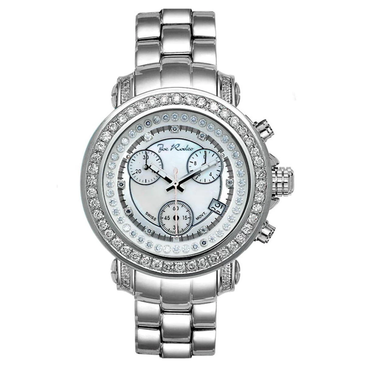 This ladies Joe Rodeo JoJo diamond watch features 2.00 carats of diamonds, a polished rounded Silver stainless steel case, scratch-free crystal glass, individually numbered and engraved stainless steel case-back. White Mother-of Pearl dial (available with black, blue, white and pink mother of pearl dials). Fine Swiss-made quartz movement with chronograph function. Water resistant to 100 m (330 ft). This luxurious women’s diamond watch by Joe Rodeo comes with two interchangeable straps in different colors. The patented strap adjusts once for a perfect fit, and comes on and off with the press of a button.