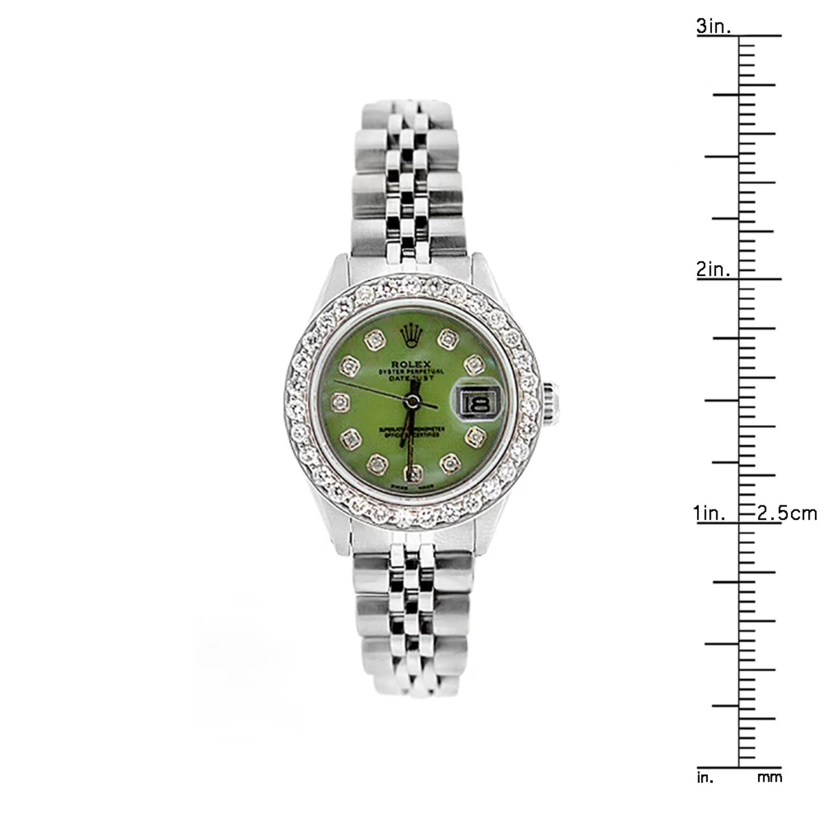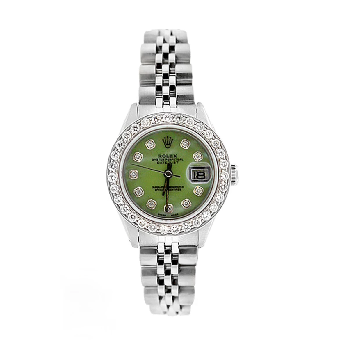 This lovely Ladies Rolex Datejust Diamond Bezel Watch with Green MOP Dial features 1.5 carats of shining round cut genuine diamonds set in on the watch bezel, a brushed stainless steel case, and a stainless steel band. This Rolex Ladies Diamond Watch showcases a unique green mother of pearl dial and a date display at the 3 o’clock position. This custom Rolex diamond watch is pre-owned, in Like New condition, and comes with an original Role box and a 5-year warranty from ItsHot.com.