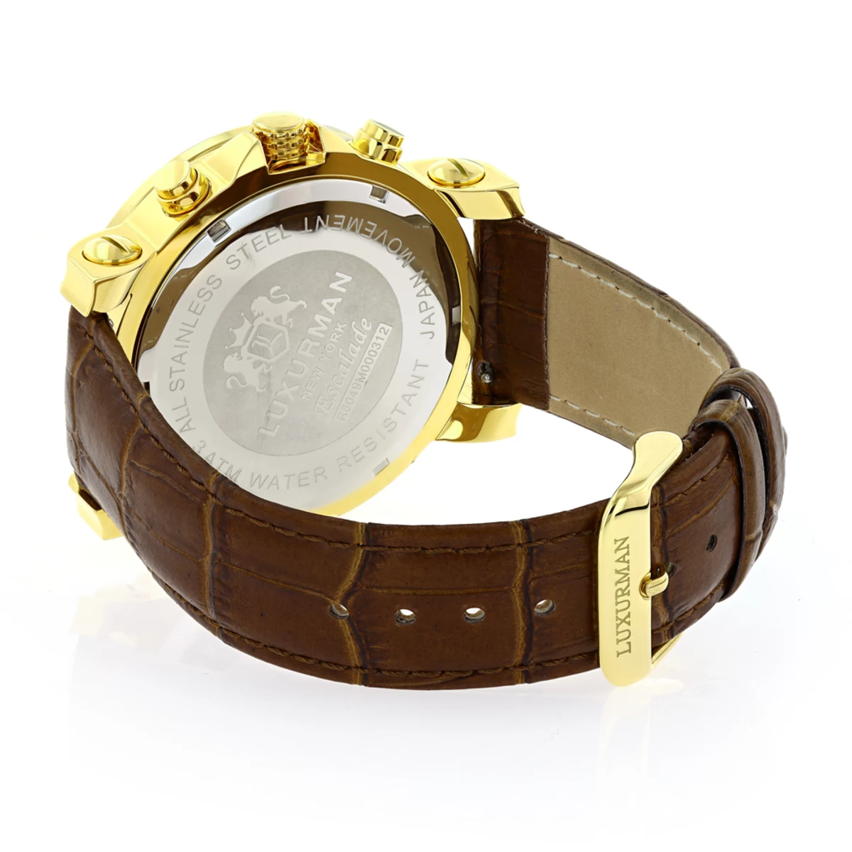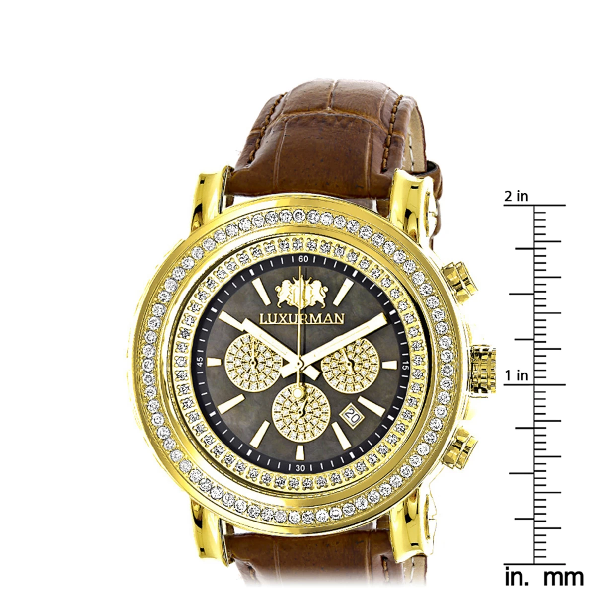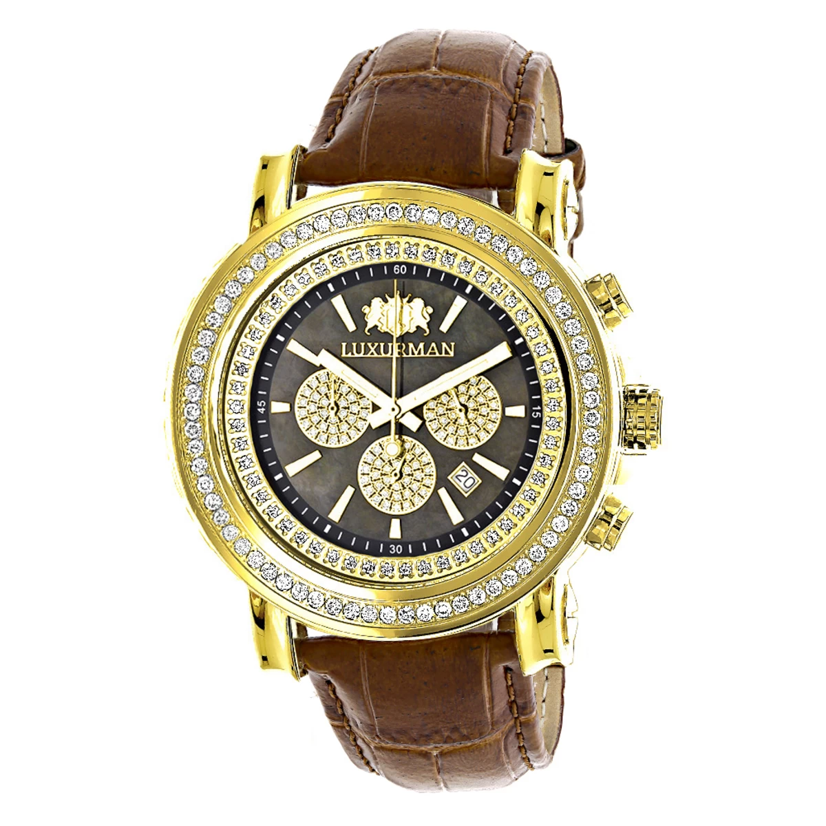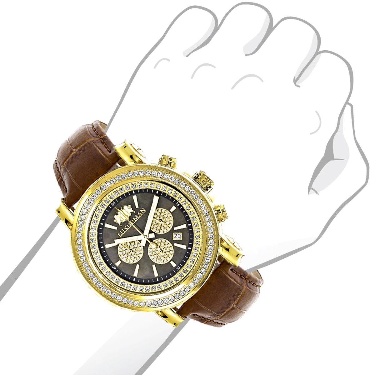 This Large Diamond Bezel Watch for Men by Luxurman Escalade Yellow Gold Plated, with Chrohograph showcases 2.5 carats of genuine diamonds and features a black mother of pearl dial accented with white sparkling stones with three chronograph subdials, a date display window, and brown leather band. This luxurious men’s diamond watch by Luxurman houses a fine Japan-made quartz movement and comes with brown leather band on the watch plus two extra interchangeable leather straps (white and black) with quick release pins so you can easily exchange them yourself without visiting a jeweler or a watch shop. This diamond watch comes with full manufacturer warranty in full retail packaging.