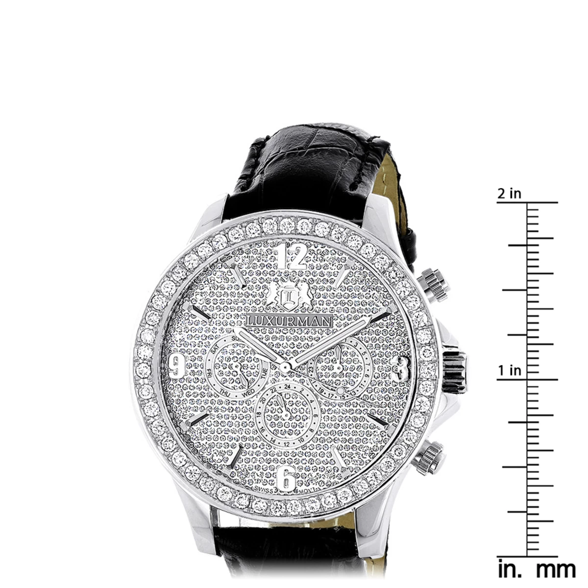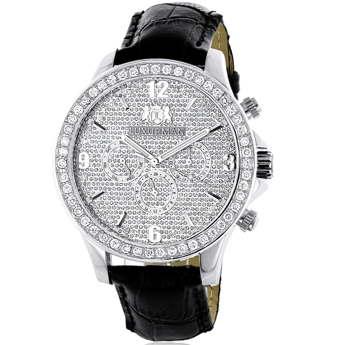 Men’s Diamond Watches: This Luxurman Men’s Watch features 3 carats of genuine diamonds, a polished silver tone stainless steel case, a black genuine leather strap and a face paved in sparkling white stones. This Luxurman men’s diamond watch showcases a fine Japan-made quartz movement and is water-resistant.