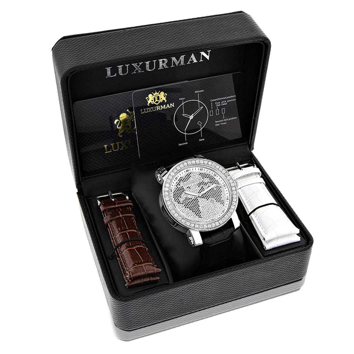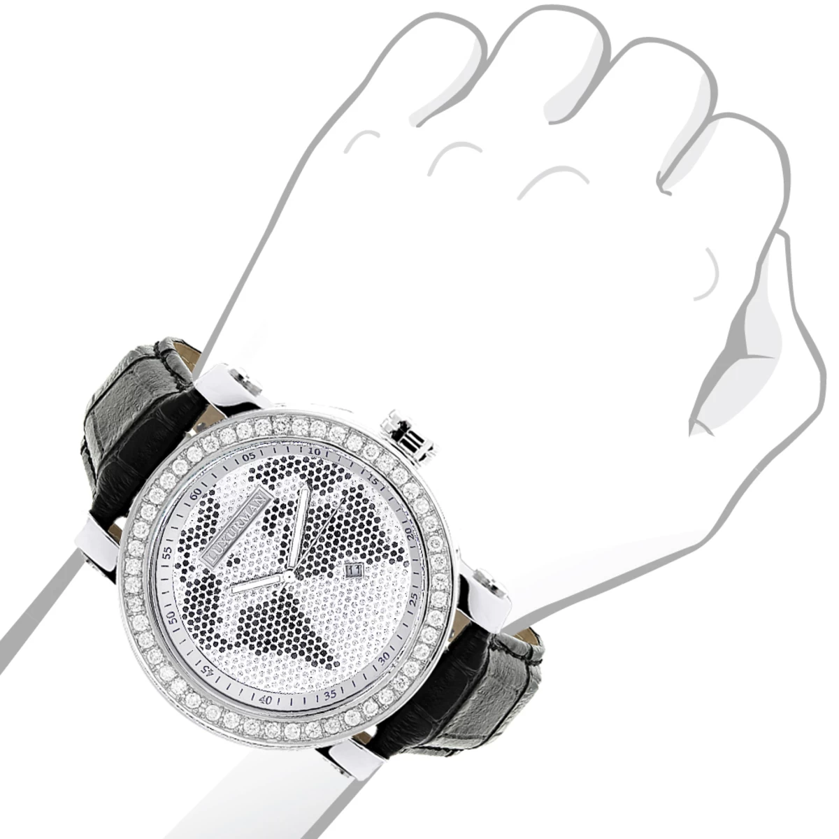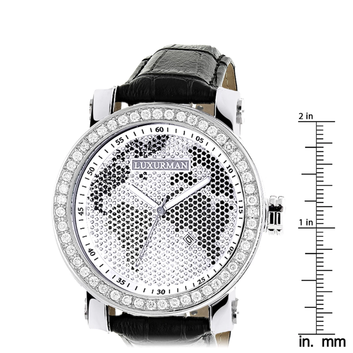 This Luxurman men’s diamond watch features 4 carats of VS quality white sparkling diamonds, polished silver stainless steel case with a soft genuine black leather band and a world map dial paved in black and white stones dial with a date display. Water-resistant to 30 m (110 ft).