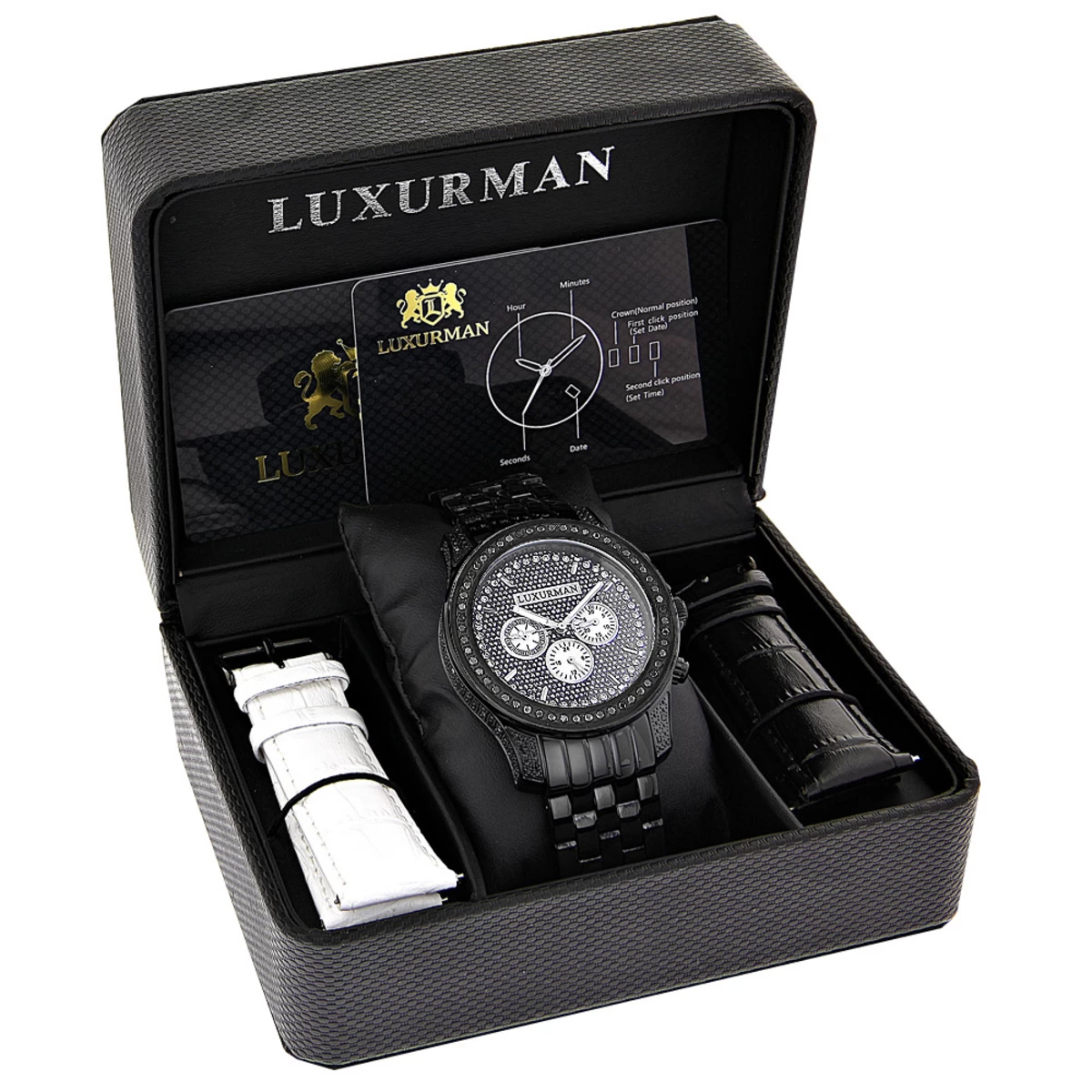 This Men’s Black Diamond Watch from LUXURMAN Designer Watches features 2.5 carats of black diamonds, a black tone stainless steel case and a black face paved in white sparkling stones with three white mother of pearl subdials. Showcasing a fine Japan-made quartz movement, this men’s diamond watch is water-resistant and makes a great gift for any occasion. The watch comes in original gift box with two extra leather bands.