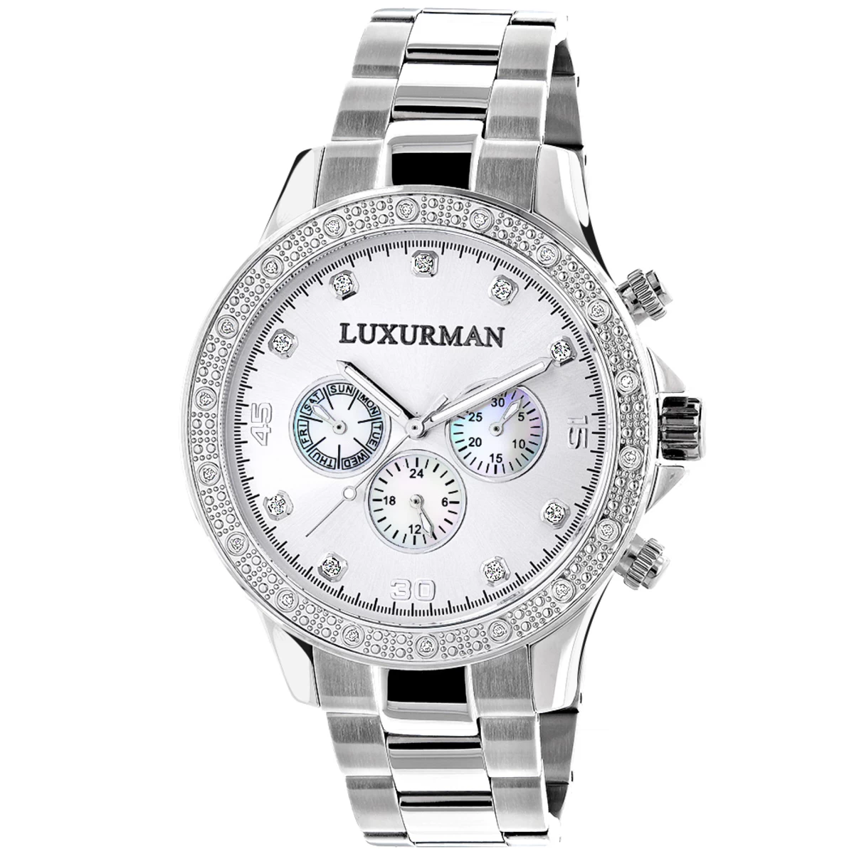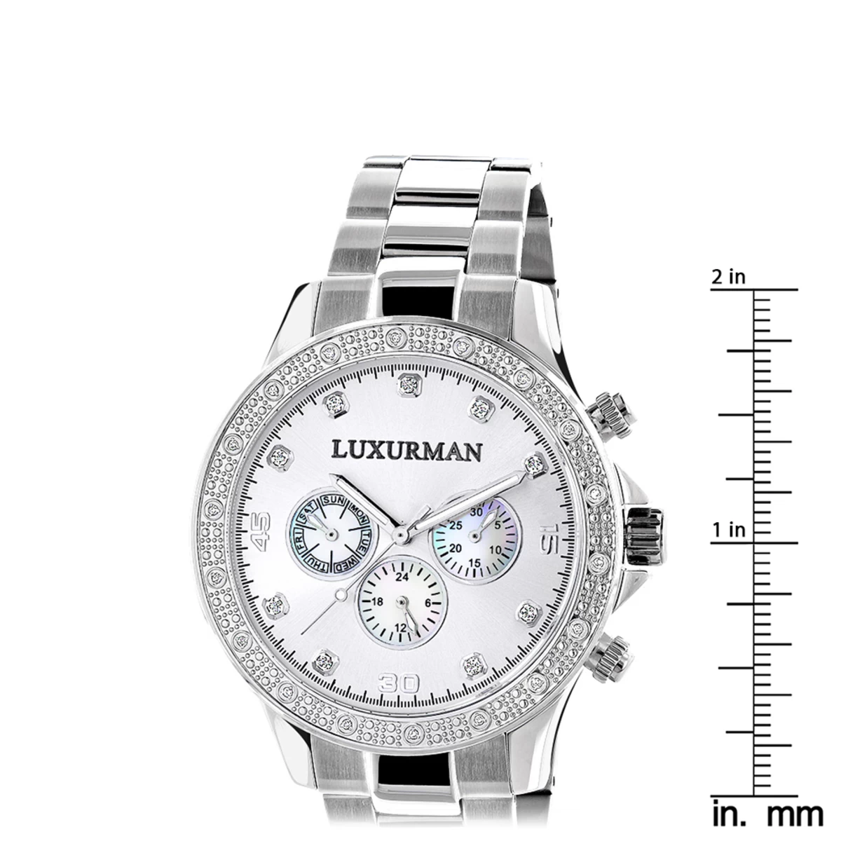 This Trendy Men’s Luxurman Diamond Watch features 0.2 carats of sparkling round diamonds. This Luxurman diamond watch showcases a silver tone dial with Date/Calendar/24 hours subdials and a silver tone stainless steel band. This men’s diamond watch by Luxurman comes with two extra interchangeable leather straps in different colors (band colors may vary). This Luxurman Diamond watch makes a perfect present for any occasion.
