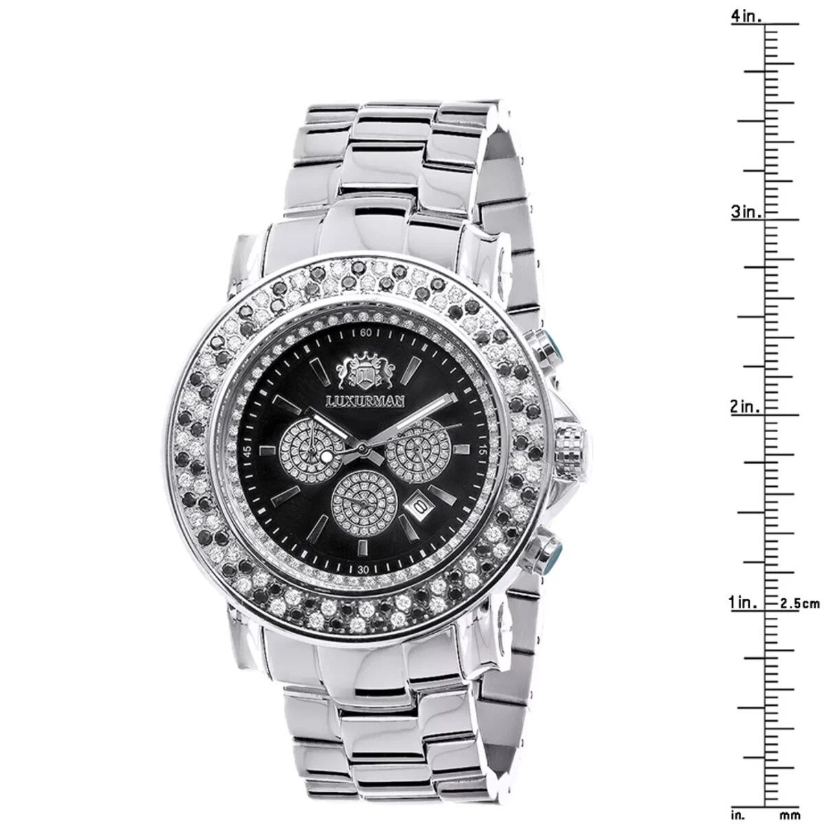 From our men’s diamond watches collection this large white and black diamond watch for men Luxurman Escalade model featuring an oversized 49mm stainless steel case, quartz movement with date and chronograph; the watch is decorated with 4 carats of dazzling white and black diamonds. This multicolor diamond watch for men showcases a black mother of pearl dial with sparkling stones with three chronograph subdials, a date display window at the 4 o’clock position, a silver tone stainless steel bracelet. This luxurious men’s diamond watch by Luxurman houses fine Japan-made quartz movement and comes in full retail packaging with two extra interchangeable leather straps in different colors (white and black) and a 5 year factory warranty.