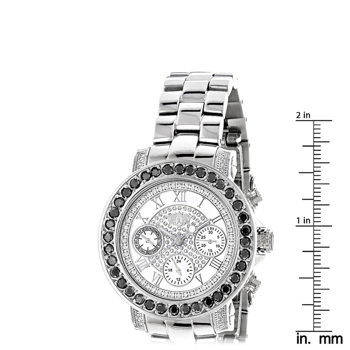 Designer Luxurman Watches! This Ladies Black Diamond Watch by Luxurman showcases 2.50 carats of fancy black diamonds on the bezel. This Luxurman diamond watch features a white face paved in white sparkling stones and three subdials, a silver tone stainless steel case and a polished silver tone stainless band. This Ladies diamond wrist watch houses a fine Japan-made quartz movement, and is conveniently water-resistant.
