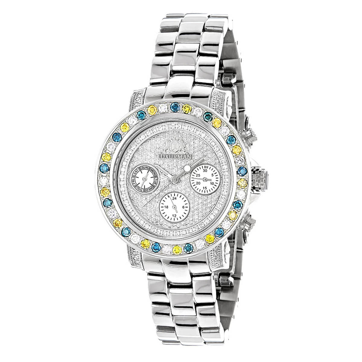Unique Luxurman Watches: This Ladies Color Diamond Watch showcases 2.75 carats of sparkling yellow, blue and white diamonds on the bezel. This Luxurman diamond watch features a dial paved in sparkling stones with three white subdials, a silver tone stainless steel case and a polished silver tone stainless steel band. This Ladies diamond wrist watch by LUXURMAN houses a fine Japan-made quartz movement, and is conveniently water-resistant.