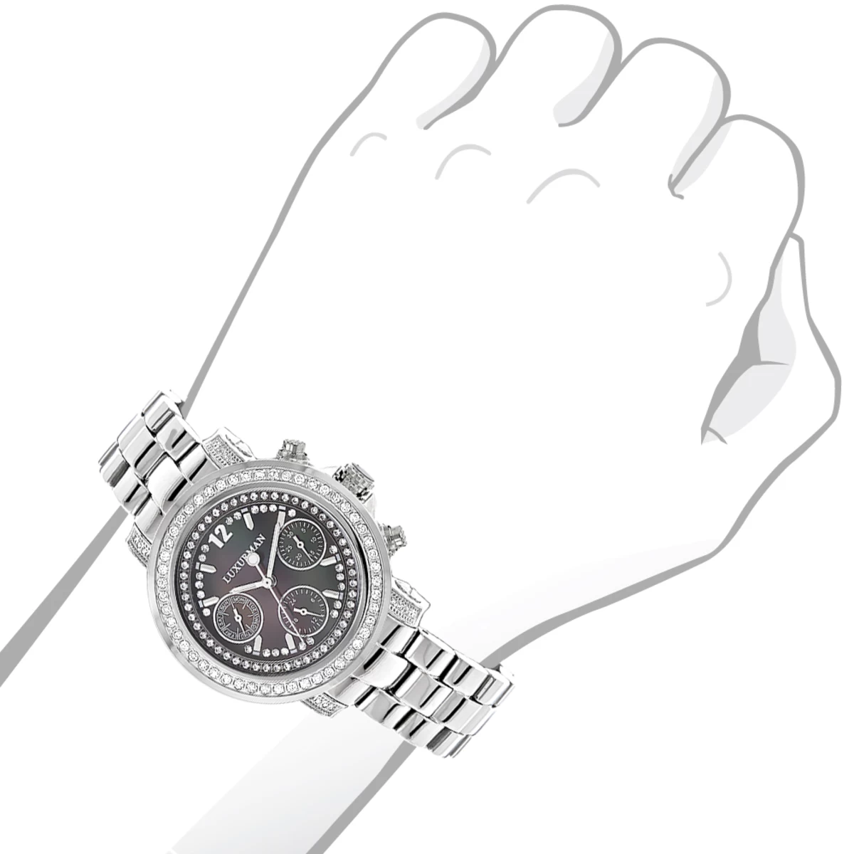 Unique Luxurman Watches: This Ladies Diamond Watch showcases 2 carats of sparkling round diamonds. This Luxurman diamond watch features a black mother of pearl dial paved in sparkling stones with three subdials, a silver tone stainless steel case and a polished stainless steel band.