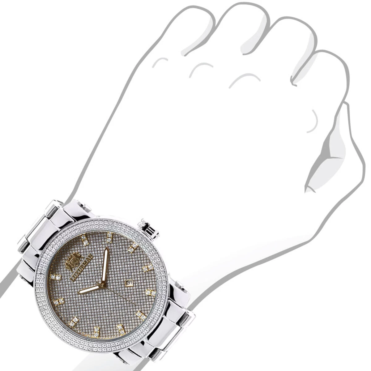 This Luxurman Men’s Diamond Watch 0.12ct Two-Tone Gold Plated Stainless Steel is a limited addition men’s wrist watch and features 0.12 carats of genuine diamonds around the bezel, a polished white gold plated stainless steel case with a stainless steel band and a yellow plated dial for a two-tone look. This Luxurman diamond watch for men is water-resistant and makes a fabulous gift for any occasion.