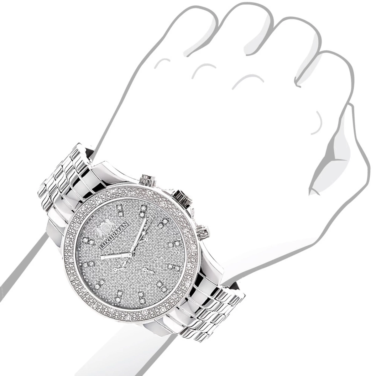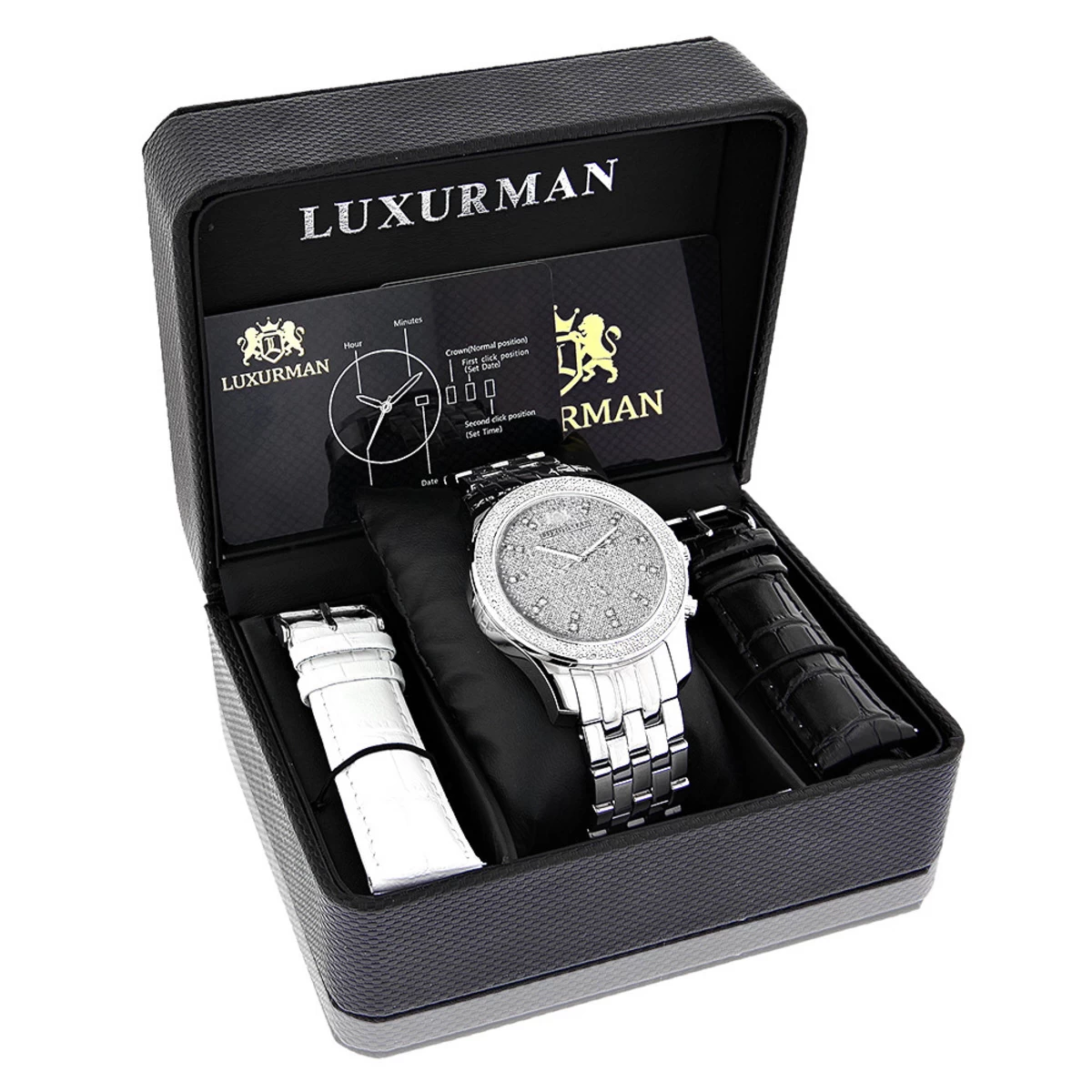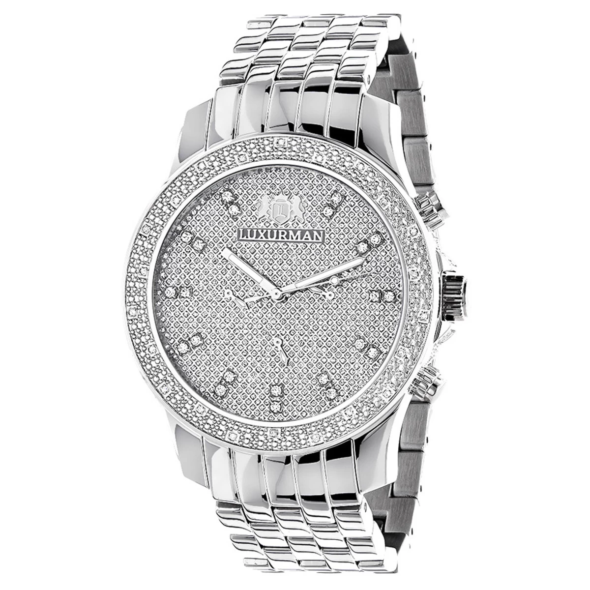 This Designer Luxurman Men’s Diamond Watch features 0.25 carats of genuine diamonds, a polished silver tone stainless steel case, a black genuine leather strap and a dial paved in white sparkling stones. This Luxurman real diamond watch showcases a fine Japan-made quartz movement and is water-resistant to 30 m (110 ft).