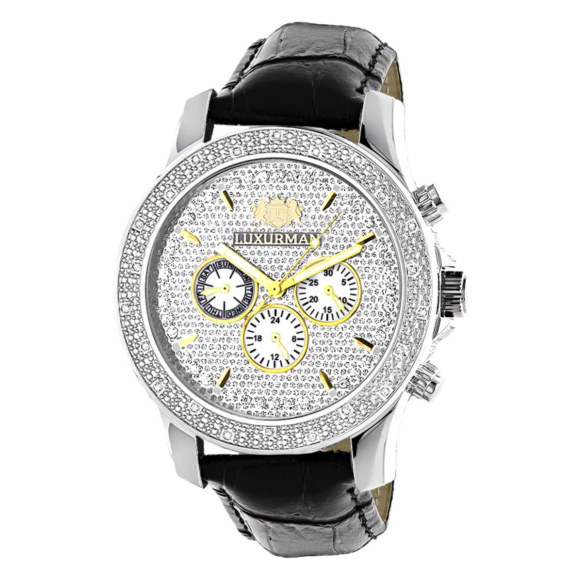 This Luxurman men’s diamond watch with a leather watch band features 0.25 carats of genuine diamonds on the bezel of the silver tone stainless steel case. This Luxurman Diamond Watch showcases a yellow gold tone dial paved in white stones with Date/Calendar/24 hours subdials and a genuine black leather band. This diamond watch by Luxurman comes with two interchangeable straps in different colors. This Luxurman Diamond watch is a perfect present for any occasion.
