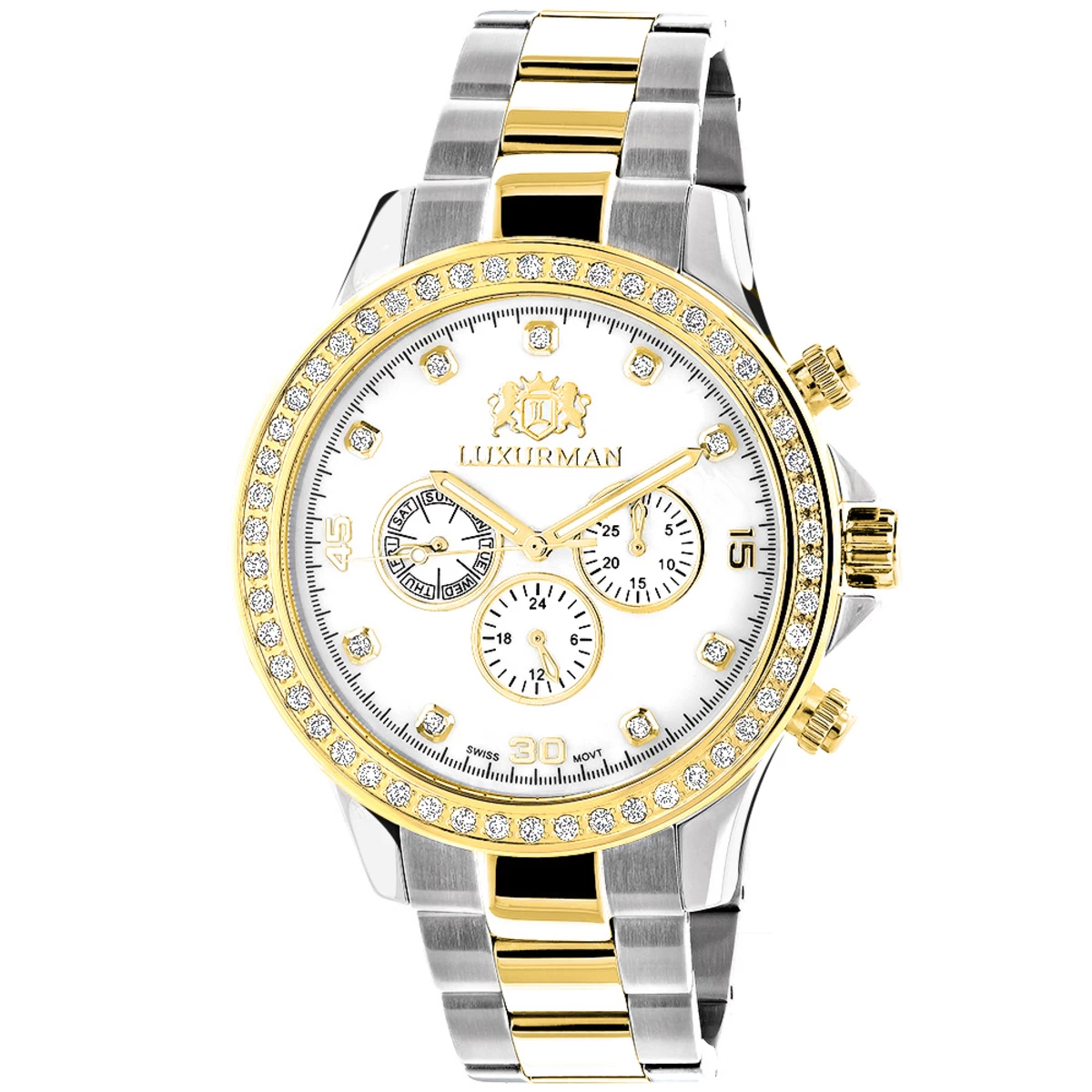 Luxurman Men’s Diamond Watches: This 18k Yellow & White Gold Plated Swiss Quartz Liberty watch showcases 2 carats of genuine round diamonds, yellow and white gold plated two-tone stainless steel case and band. This luxurious diamond watch for men by Luxurman comes in full retail packaging with two extra interchangeable extra leather straps in different colors and 5 year manufacturer’s warranty and showcases a white mother of pearl face with three subdials and a quality Swiss Quartz movement.