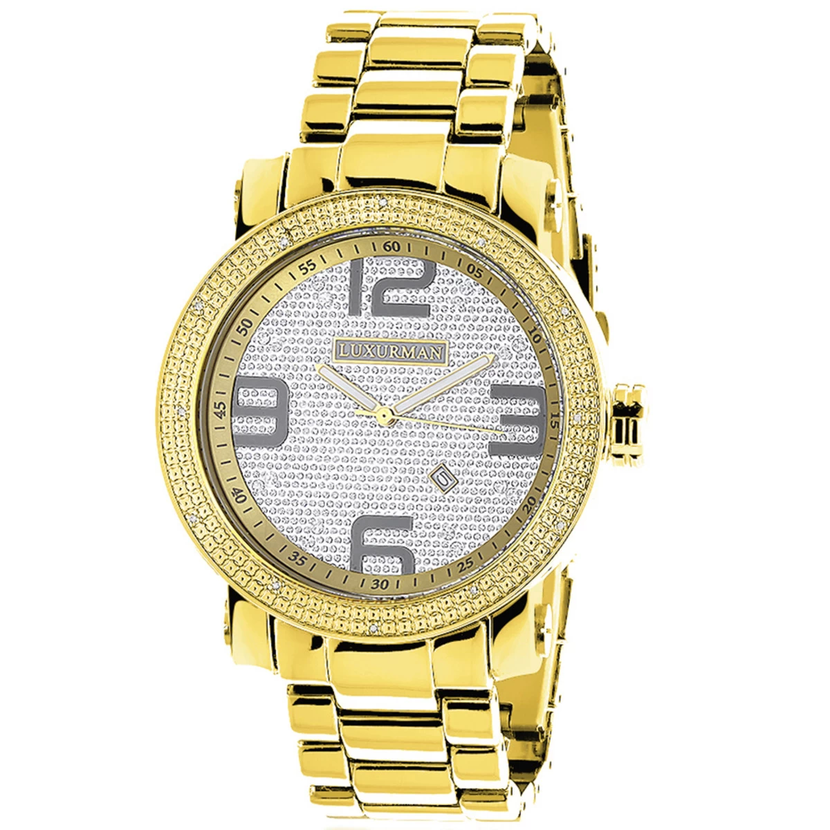 This Luxurman Men’s Diamond Watch is Yellow Gold Plated and features 0.12 carats of genuine diamonds around the bezel, a polished yellow gold tone metal case with a metal band and a yellow face paved in white sparkling stones. This elegant LUXURMAN diamond watch showcases a fine Japan-made quartz movement and is water-resistant to 30 m (110 ft).