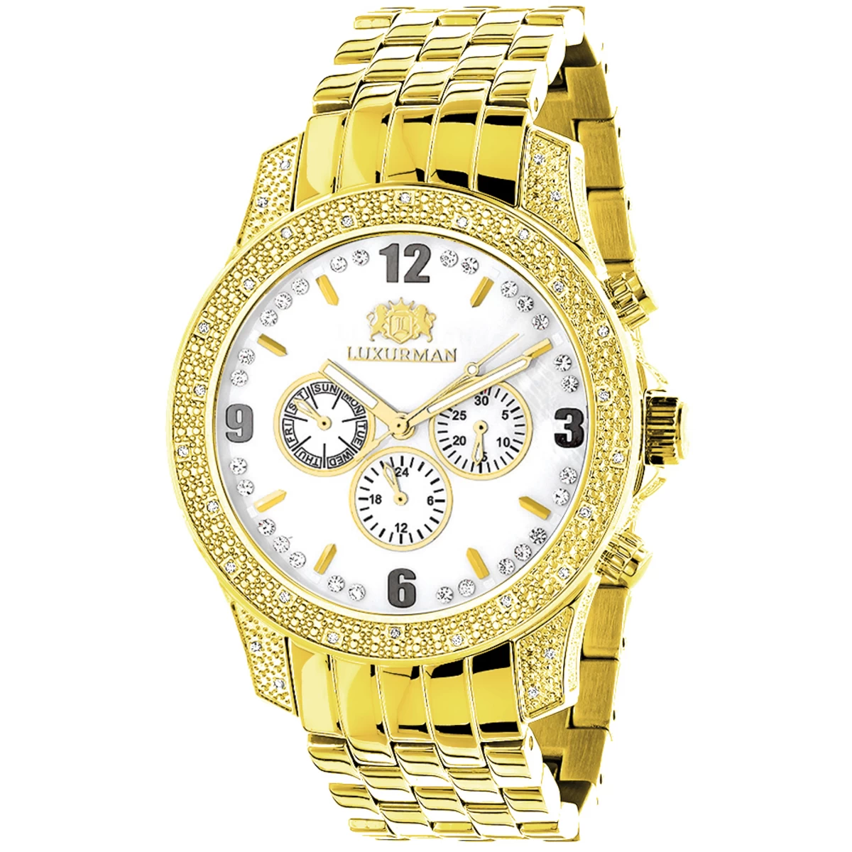 Discount Luxurman Watches! This Men’s Yellow Gold Tone Diamond Watch by LUXURMAN showcases 0.50 carats of genuine diamonds on the sides, lugs and bezel of a polished yellow gold tone stainless steel case. Featuring a white mother of pearl face with three chronograph subdials and a date display, this luxurious men’s diamond watch by Luxurman houses a fine Japan-made quartz movement and is conveniently water-resistant to 30 m (110 ft).