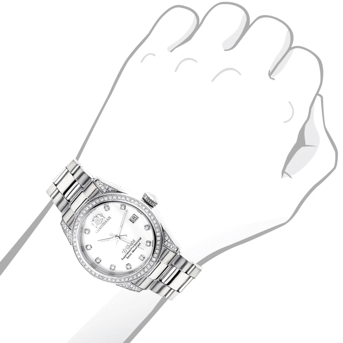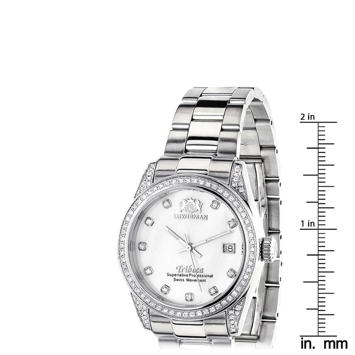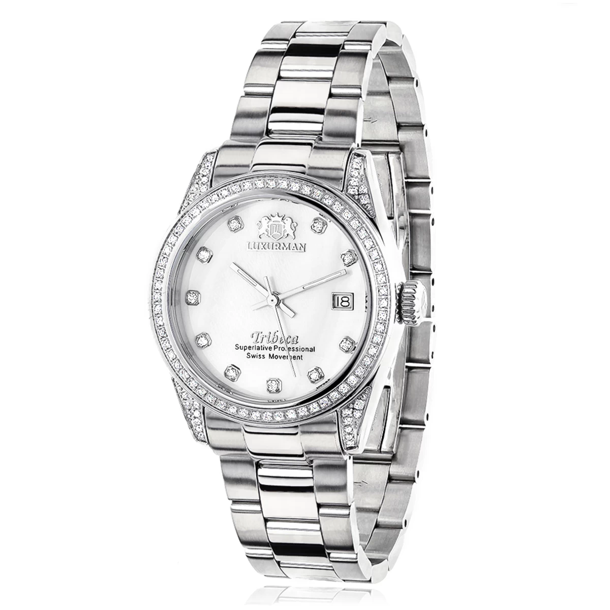 Swiss Quartz Watches: This Luxurman Women’s Diamond Watch Stainless Steel Band Tribeca features 1.5 carats of genuine diamonds, a luxurious mother of pearl dial, Swiss movement and a date display window at a 3 o’clock position. This stylish women’s diamond Luxurman watch comes with two extra leather interchangeable straps in different colors and full 5 year factory warranty. This Luxurman Diamond watch is a perfect present for any occasion.