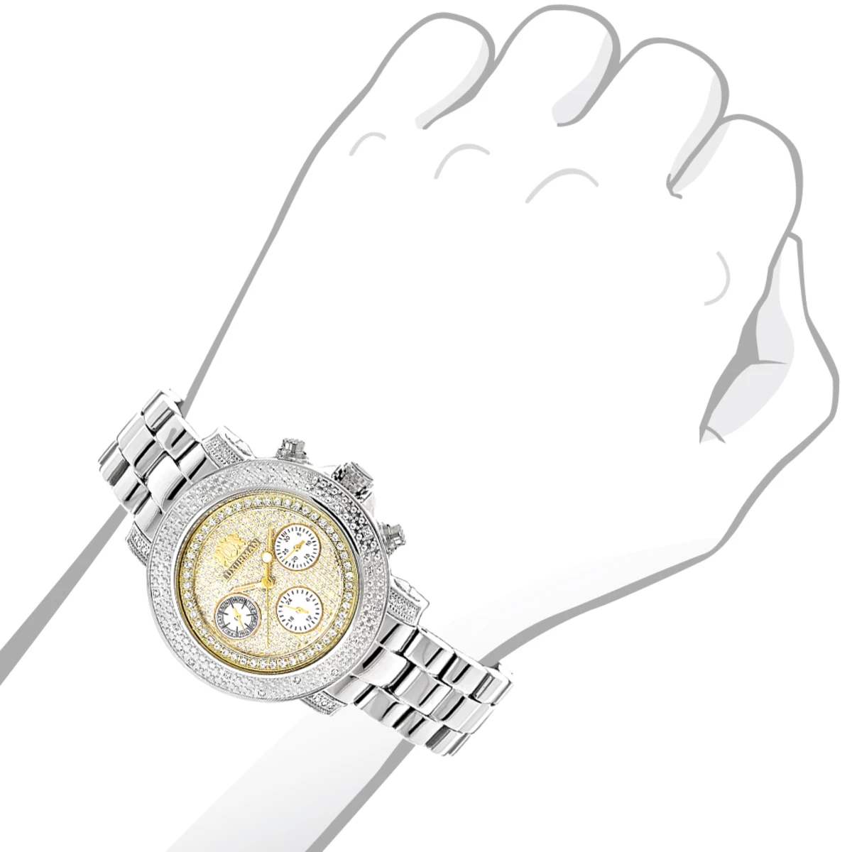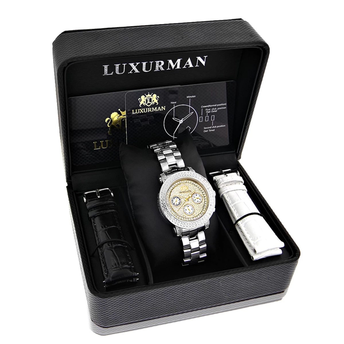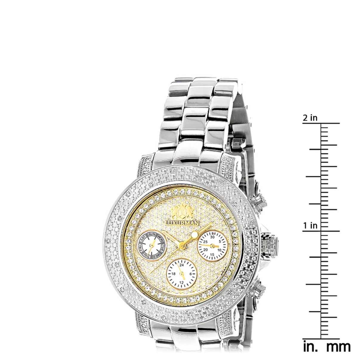 This Luxurman Women’s Diamond Montana Watch Two Tone Gold Plated with a Shiny Steel Band is a uniquely designed watch and features 0.3 carats of genuine diamonds, a polished gold plated stainless steel case, a yellow gold tone dial paved in sparkling stones with white mother of pearl subdials. This women’s diamond Luxurman watch comes with two extra interchangeable straps in different colors. This Luxurman Diamond watch is a perfect present for any occasion.