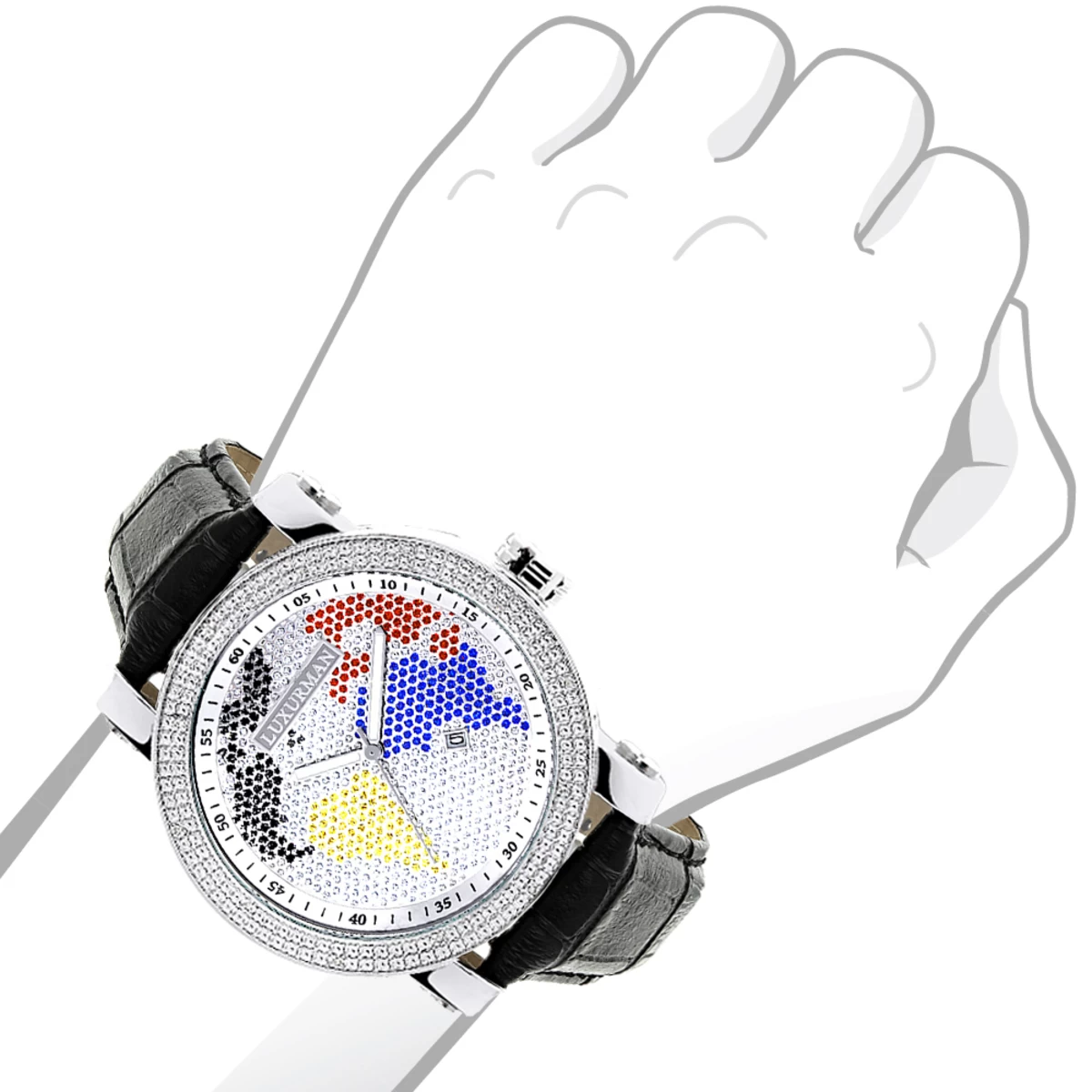 Exclusive Luxurman Watches! This Worldface Men’s Diamond Watch by Luxurman features 0.18 carats of VS/SI diamonds, a polished silver stainless steel case with a soft genuine black leather band and a silver stainless steel dial paved in multicolor stones. This Luxurman diamond watch is conveniently water-resistant to 30 m (110 ft). Luxurman watches are the only watches in this price range featuring high quality VS/SI diamonds. Why settle for anything less?