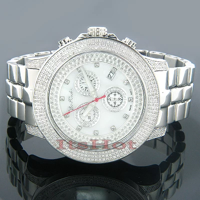 Affordable Luxury Watches! This Joe Rodeo Pilot Men’s Diamond Watch has a huge 52mm silver gold stainless steel case with 3.15 ct. of round sparkling diamonds set on its bezel and lugs. The white mother of pearl face has three chronograph subdials, a date display window at 4 o’clock position and glistening white stones set as hour markers. This men’s diamond wrist watch is equipped with a super accurate Swiss-made chronograph quartz movement. The case is water-resistant 100m (330 ft).