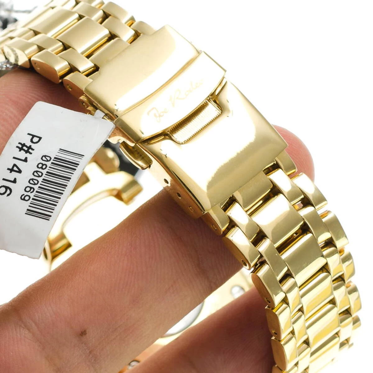 This impressive 0.90-carat Master Ladies JOJO Diamond Watch features a scratch-free crystal glass, an individually numbered and engraved stainless steel case-back, a genuine diamond bezel, a polished yellow gold Tone Stainless Steel case, a yellow crystal dial, a fine Swiss-made quartz movement with a chronograph function, a center second and date. This women’s Joe Rodeo diamond watch is water-resistant to 50 meters and comes with two interchangeable straps in different colors. The patented strap adjusts once for a perfect fit, and comes on and off with the press of a button.