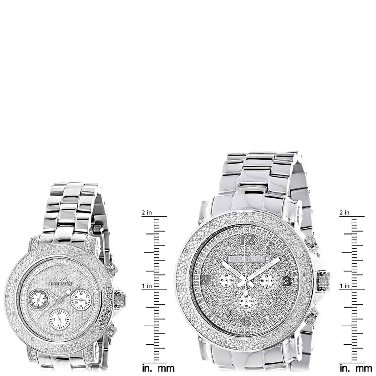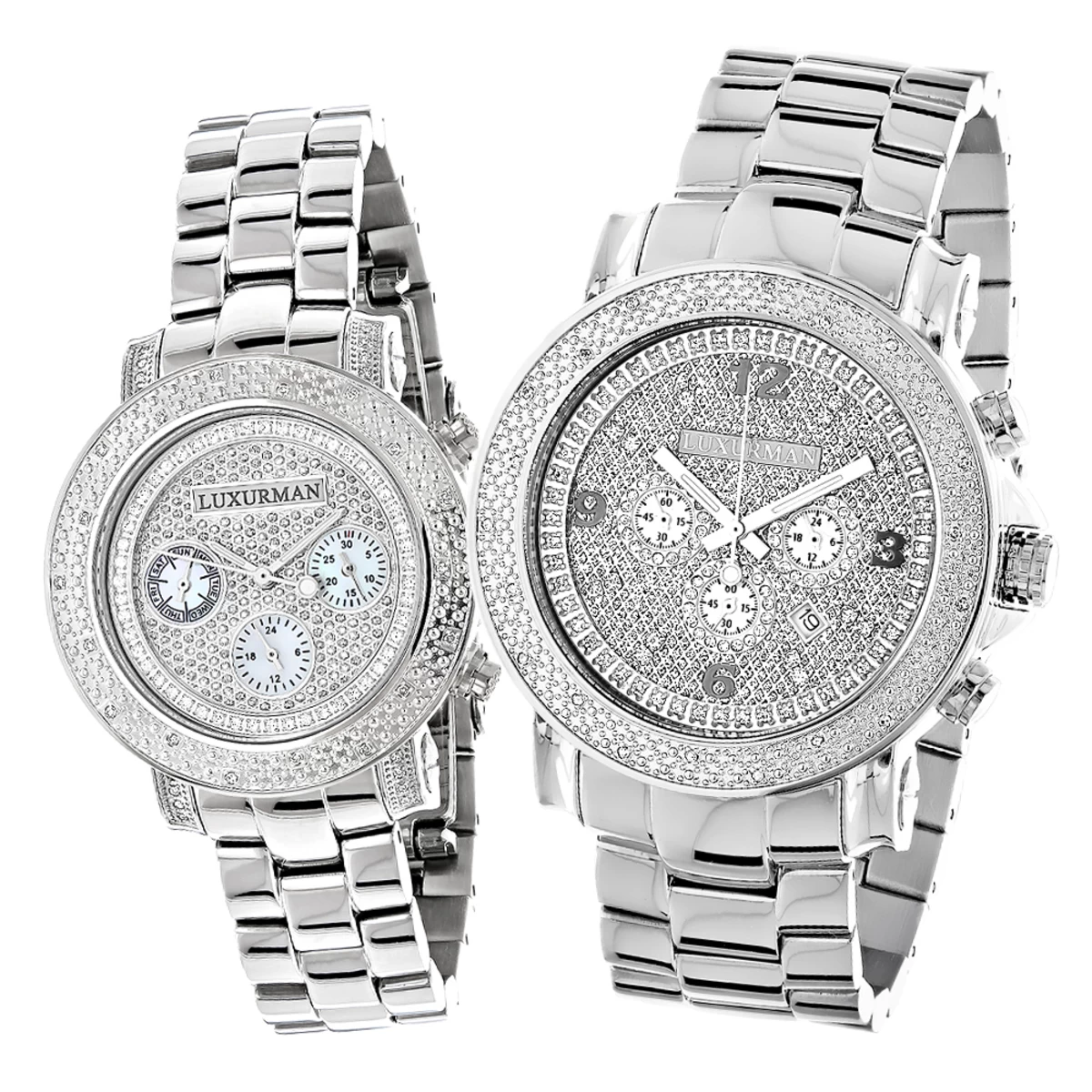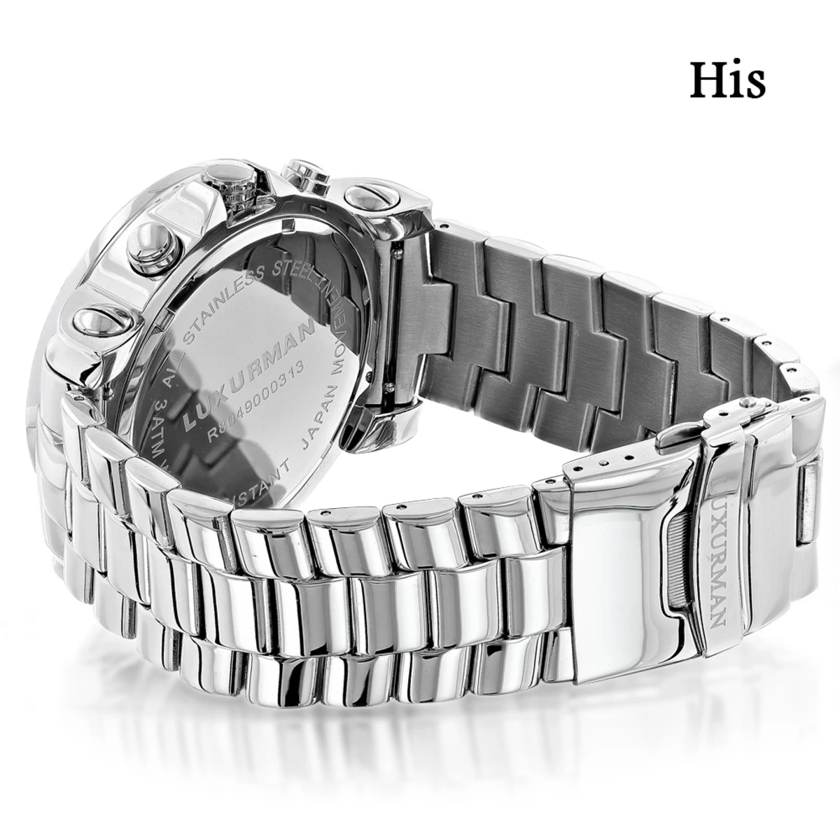 Matching His and Hers Watches: Oversized Diamond Watch Set; these two matching Luxurman diamond watches are plated in white gold featuring paved face, a white gold plated stainless steel case and white gold plated stainless steel band. Both of these Luxurman diamond watches are conveniently water-resistant to 3 ATM and come with a 2 year manufacturer’s warranty. The Luxurman Diamond Watch for Her features 0.3 carats of genuine diamonds masterfully set on the white gold plated stainless steel case, the dial has three subdials and is fully paved in white stones. The Oversized Diamond Watch for Him showcases 0.25 carats of genuine diamonds, features a dial paved in sparkling stones with three white mother of pearl chronograph subdials, a date display window at the 4 o’clock position, and a silver tone stainless steel bracelet. Having a nice set of his and hers watches is really sweet gesture, since you are going to think of each other as you look down at the watch when wearing it. These matching women’s and men’s diamond watch set make a great present for any occasion!