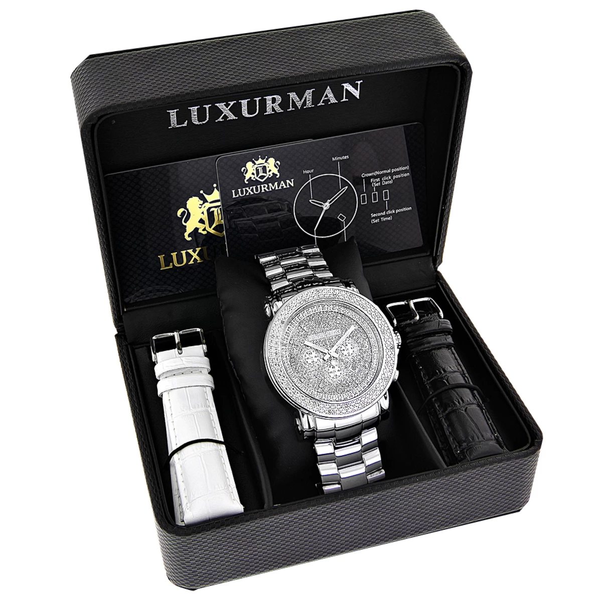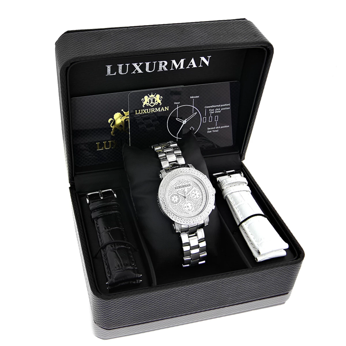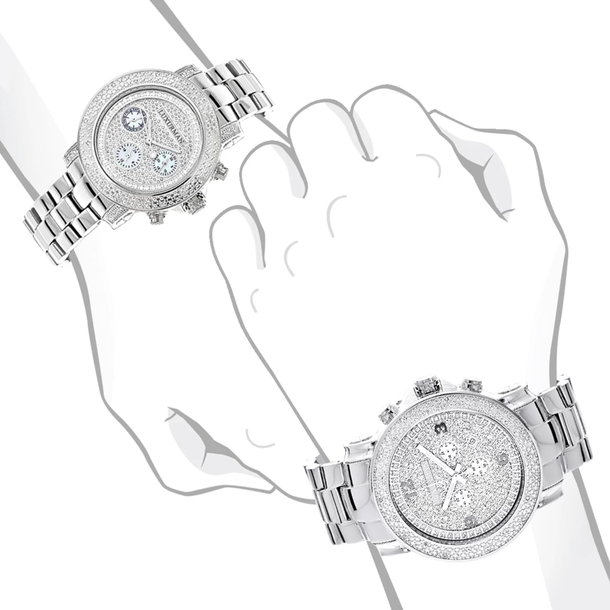 Matching His and Hers Watches: Oversized Diamond Watch Set; these two matching Luxurman diamond watches are plated in white gold featuring paved face, a white gold plated stainless steel case and white gold plated stainless steel band. Both of these Luxurman diamond watches are conveniently water-resistant to 3 ATM and come with a 2 year manufacturer’s warranty. The Luxurman Diamond Watch for Her features 0.3 carats of genuine diamonds masterfully set on the white gold plated stainless steel case, the dial has three subdials and is fully paved in white stones. The Oversized Diamond Watch for Him showcases 0.25 carats of genuine diamonds, features a dial paved in sparkling stones with three white mother of pearl chronograph subdials, a date display window at the 4 o’clock position, and a silver tone stainless steel bracelet. Having a nice set of his and hers watches is really sweet gesture, since you are going to think of each other as you look down at the watch when wearing it. These matching women’s and men’s diamond watch set make a great present for any occasion!