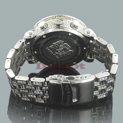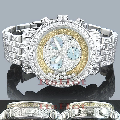 This Men’s Custom Benny Co floating diamond watch is a true sensation! Only 3 of these luxurious, iced out watches were ever made! Round 44mm (1 3/4 inch) totally iced out polished round stainless steel case, sapphire crystal glass, individually numbered and engraved stainless steel case-back. One-row of VS quality diamonds on top bezel, bezel side, dial, lugs, both sides of the case and the band are hand-set with carats of amazing G/VS-quality white and yellow full Belgian-cut diamonds. The watch face with floating diamonds on it is paved with white and yellow diamonds. The case of the watch is water-resistant to 100m (330 ft) and houses a fine Swiss-made quartz movement with chronograph function. This diamond watch is one of a kind, so don’t miss it!