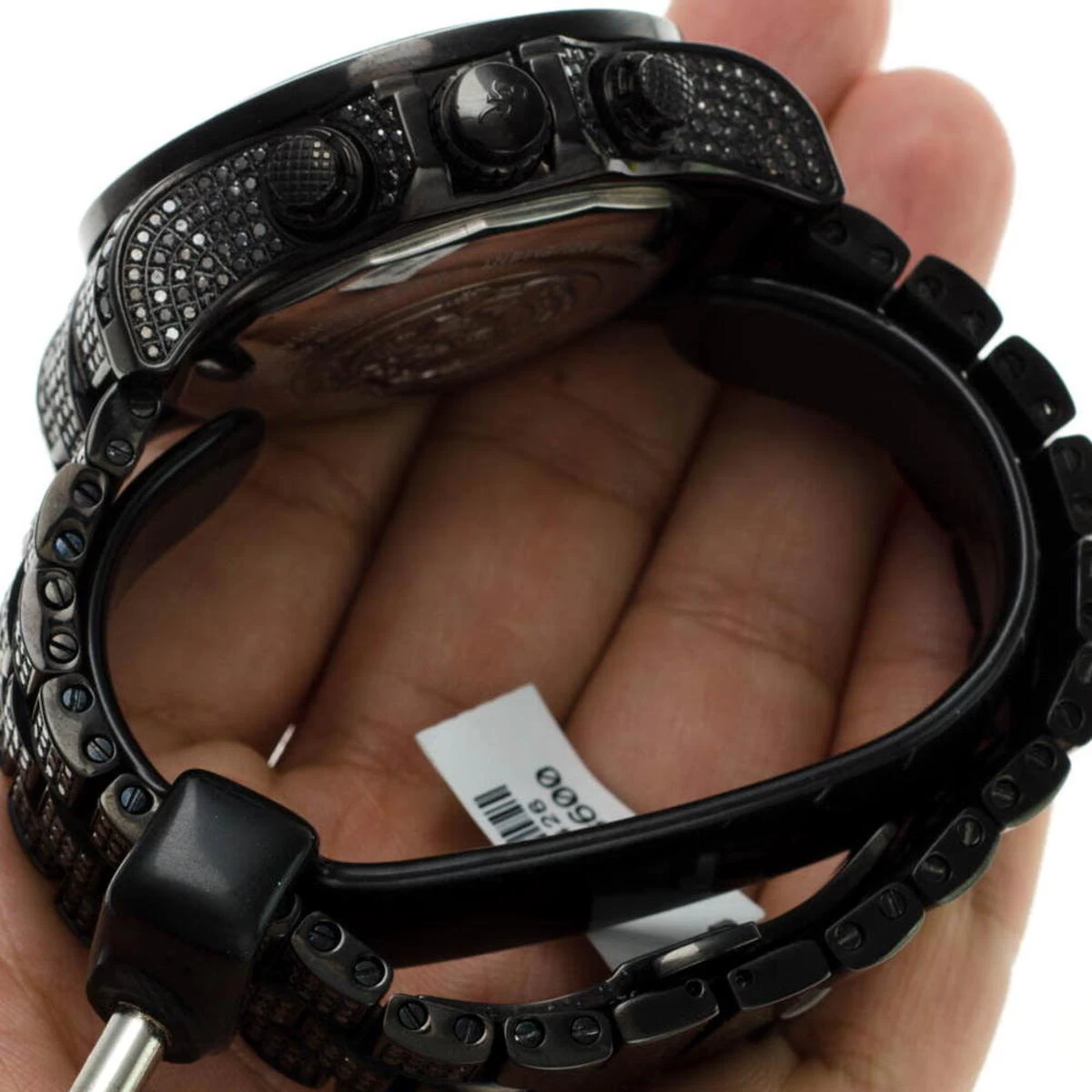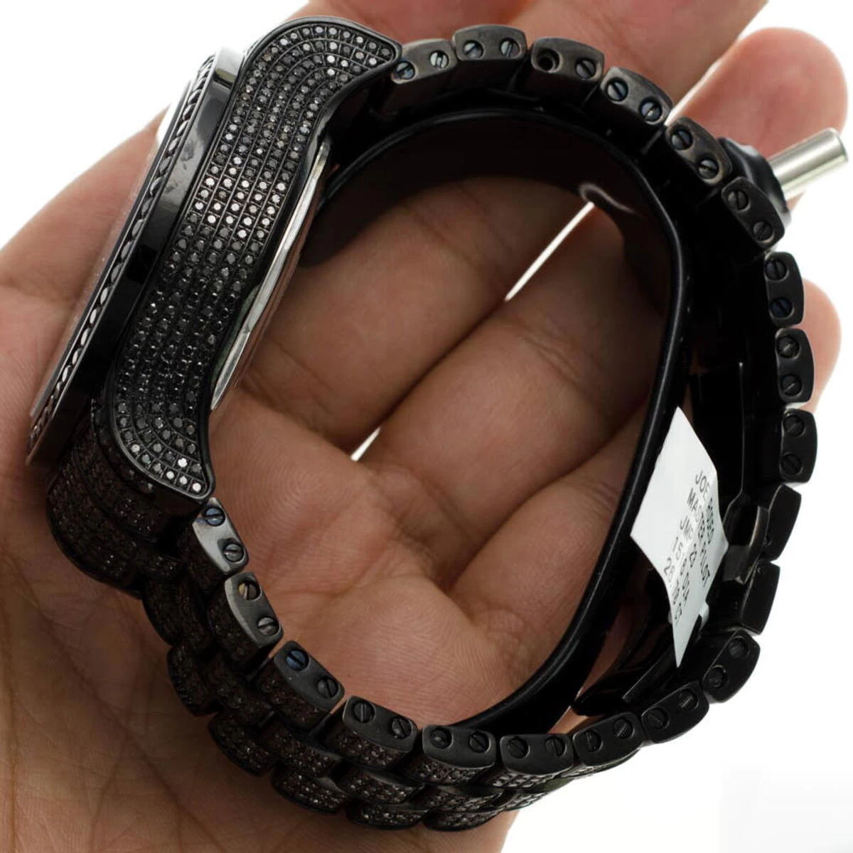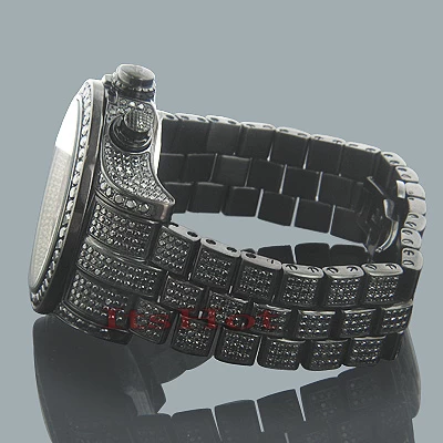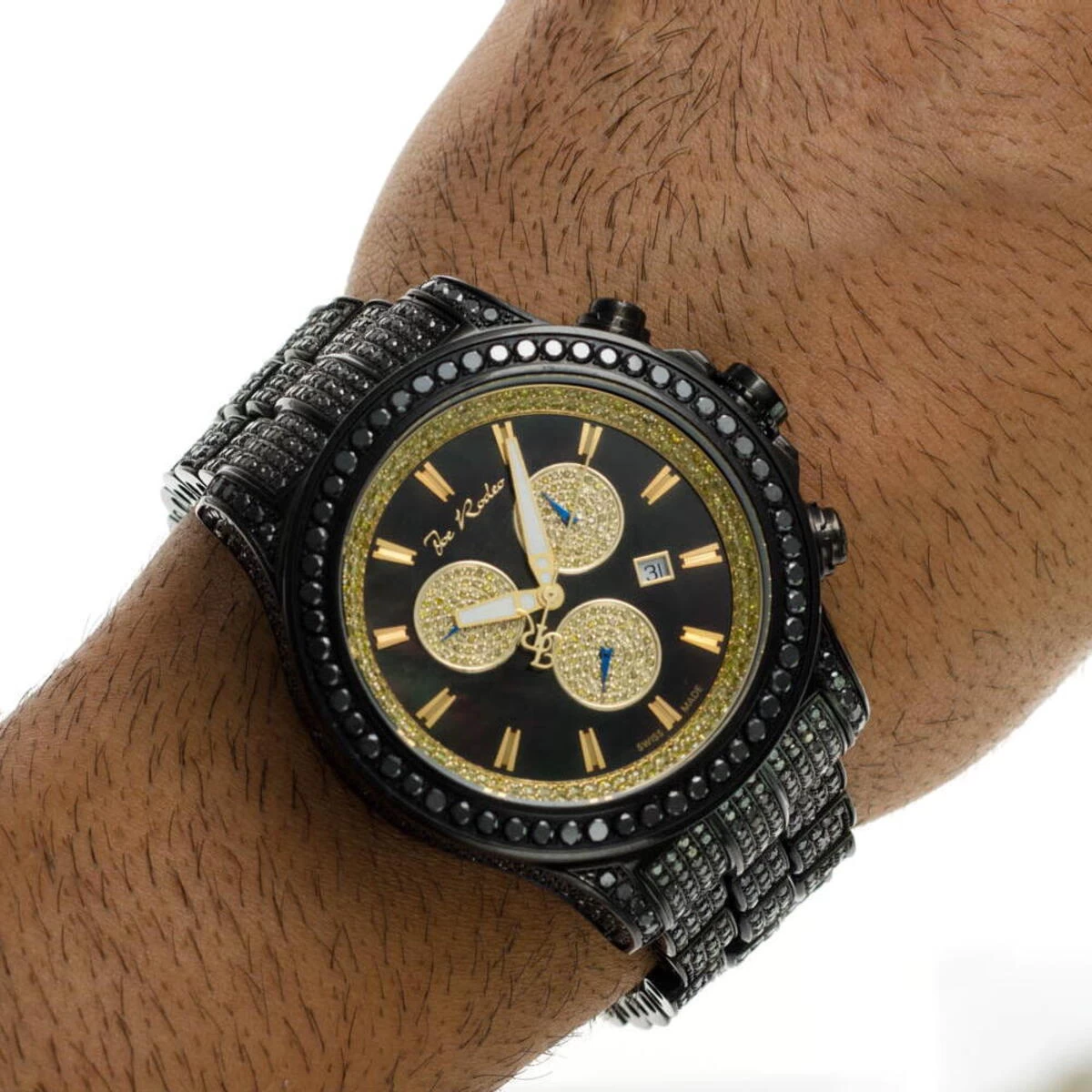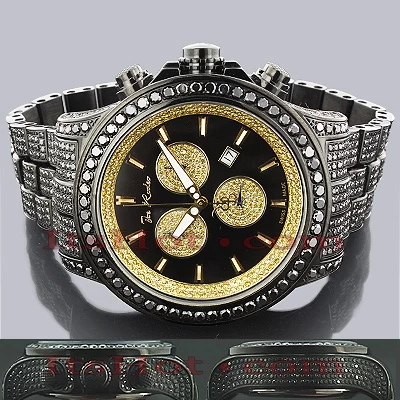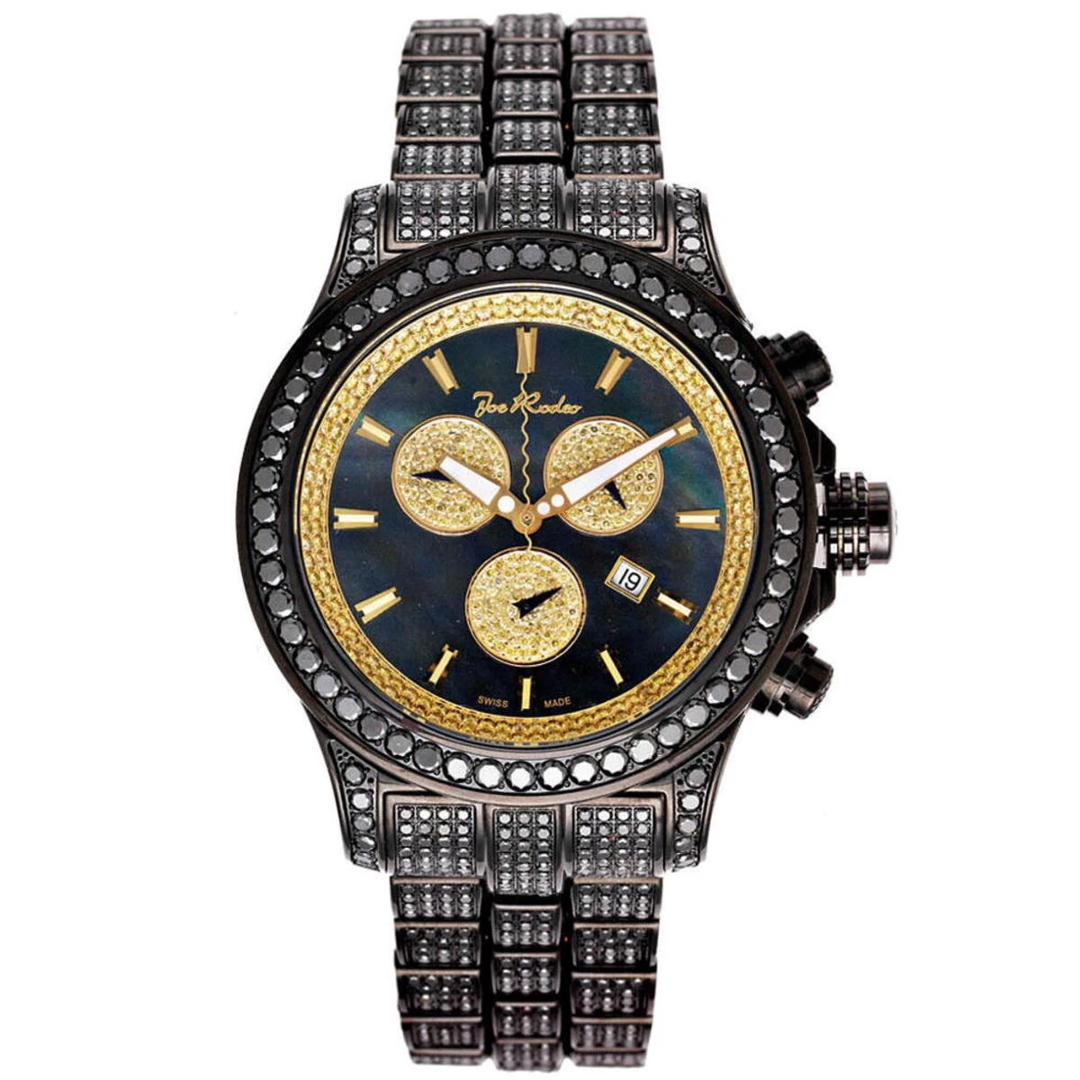 Luxurious Joe Rodeo Watches! This Black Diamond Men’s Watch – Joe Rodeo Master Pilot men’s watch – features 26.70 carats of beautiful, fancy black diamonds on the bezel, sides and lugs of the black stainless steel case and band. This exquisite Joe Rodeo diamond watch showcases a black mother of pearl dial with three chronograph subdials paved in sparkling yellow stones, a date display window at the 4 o’clock position, yellow gold tone stainless steel hour markers and hands and a 2-row of glistening yellow stones around the dial, all protected by a scratch-free crystal glass. This luxurious men’s black diamond watch by Joe Rodeo is equipped with a super accurate Swiss-made chronograph quartz movement. The case is water-resistant to 100m (330 ft).