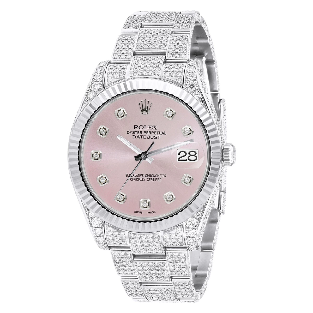 Men’s Diamond Iced Out Watch Rolex Datejust 41mm Rose Dial Oyster Bracelet. This diamond Rolex watch is pre-owned, in excellent condition, and comes in a Rolex box with a full warranty from ItsHot. Customize the look of the watch if you prefer with diamond bezel or fluted bezel. Each watch can be additionally customized with diamonds on the case as well as band (please contact us for details).