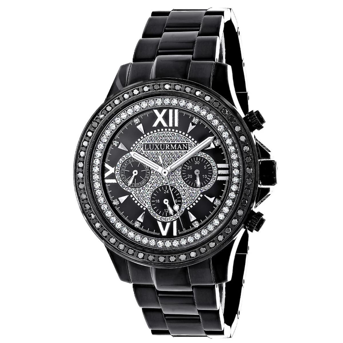 Men’s Diamond Watches: This Luxurman Black Diamond Watch Liberty model showcases 2 carats of sparkling black diamonds and features a black mother of pearl dial paved in sparkling stones with three subdials, a black tone stainless steel case and band. It comes with 2 extra leather bands in different colors with quick release pins and includes a 2 year manufacturer’s warranty.