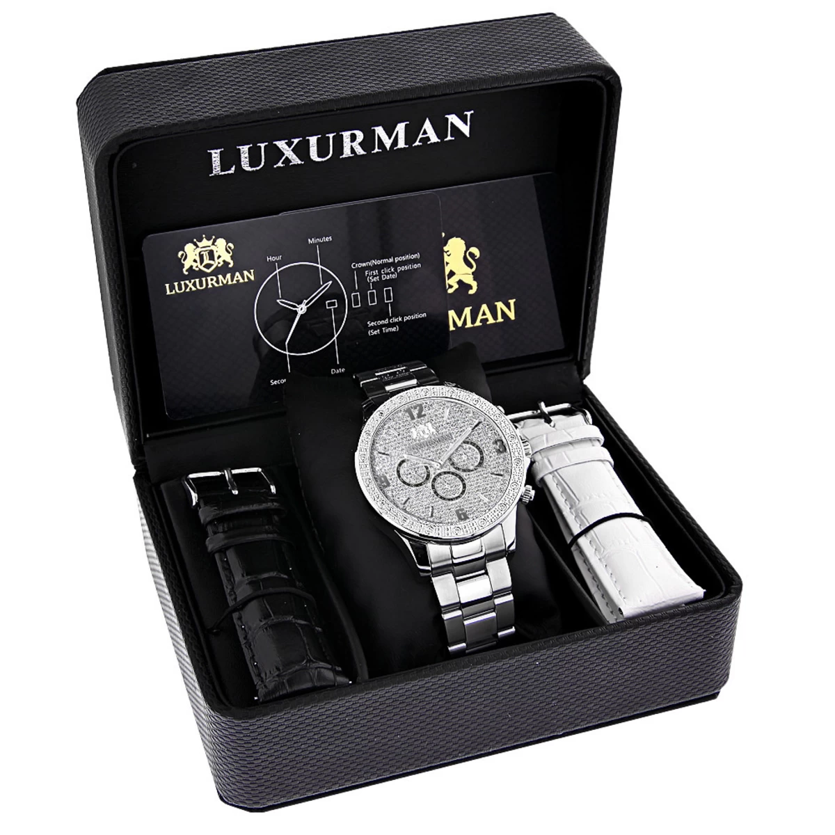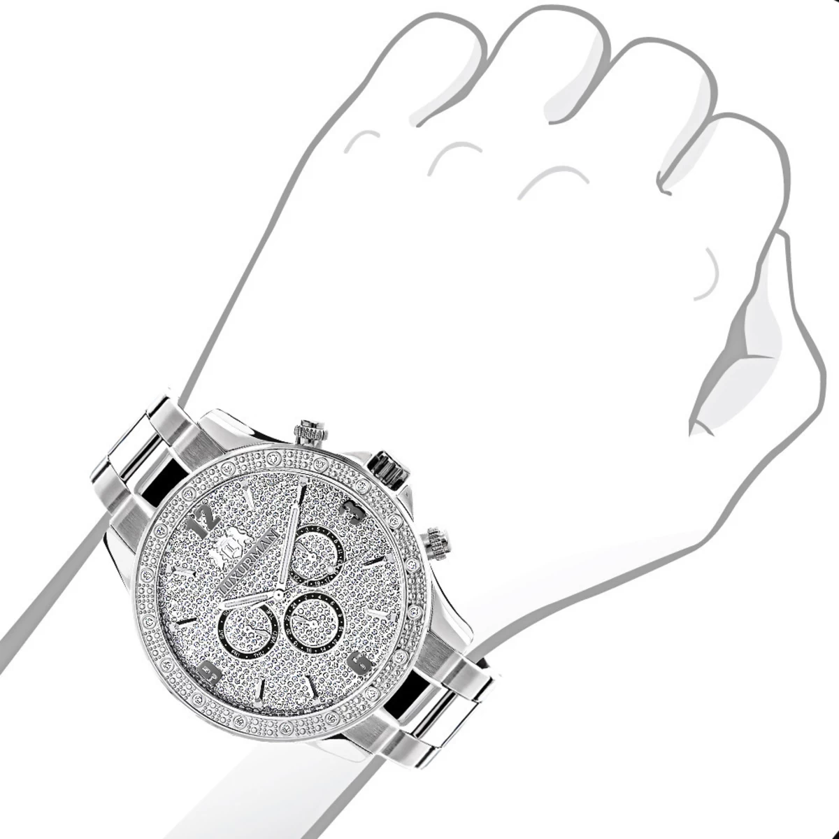 Men’s Diamond Watches collection: This Designer Men’s Diamond Luxurman Midsize Watch – New Arrival – features 0.20 carats of sparkling diamonds on the bezel of the silver tone stainless steel case. This Luxurman diamond watch showcases a dial with Date/Calendar/24 hours subdials paved in sparkling stones, and a silver tone stainless steel band. This men’s diamond watch by Luxurman comes with two extra interchangeable straps in different colors. This Luxurman Diamond watch makes a perfect present for any occasion.