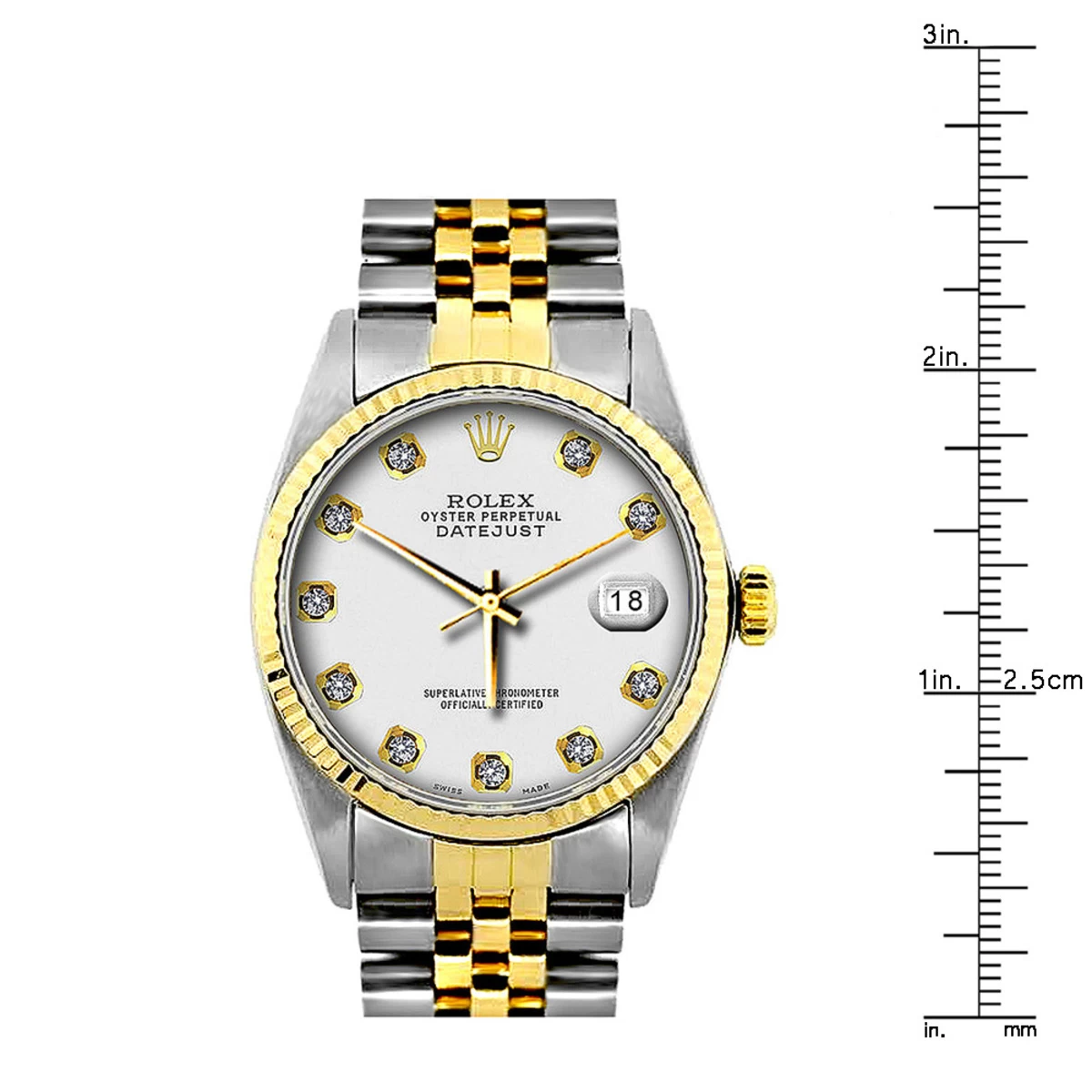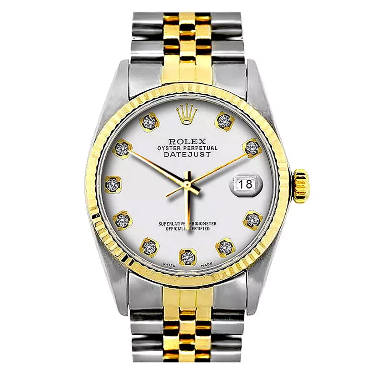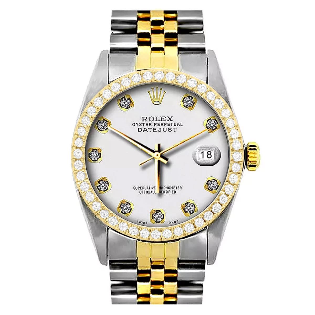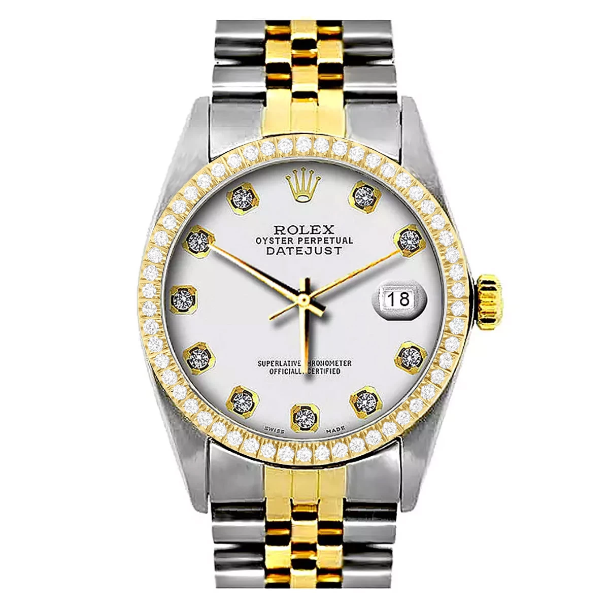 This amazing Two Tone Men’s Diamond Rolex Oyster Perpetual Datejust Gold & Stainless Steel Watch features 0.1 carats of sparkling round cut genuine diamonds, a 36mm brushed stainless steel case, and yellow gold bezel, and a two-tone Jubilee bracelet. This Rolex Diamond Watch for Men showcases a classic white dial and a date display at the 3 o’clock position. This custom Rolex diamond watch is pre-owned, in Like New condition, and comes with a retail box and a 5-year warranty from ItsHot.com.