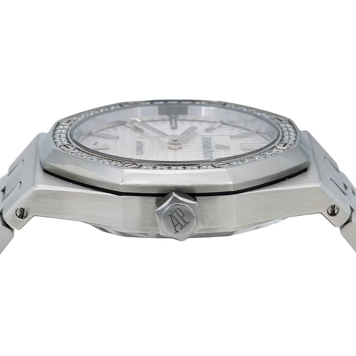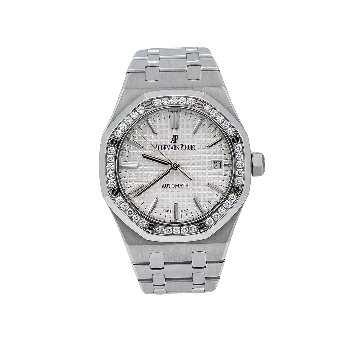 The Audemars Piguet Royal Oak 37mm White Dial Men’s Diamond Watch is a luxurious timepiece that is sure to turn heads. Featuring a stainless steel case and bracelet with a white bezel set with diamonds, this watch is sure to make a statement. The white dial is adorned with silver-tone hands and markers, and the sapphire crystal provides a clear view of the time. The automatic movement ensures accuracy and reliability, and the watch is water resistant up to 5 ATM. The engravable case back makes this watch a perfect gift for a special someone. With a 5-year warranty, this watch is sure to be a treasured timepiece for years to come. Whether you’re looking for a special gift or a luxurious timepiece for yourself, the Audemars Piguet Royal Oak 37mm White Dial Men’s Diamond Watch is sure to be a timeless classic.