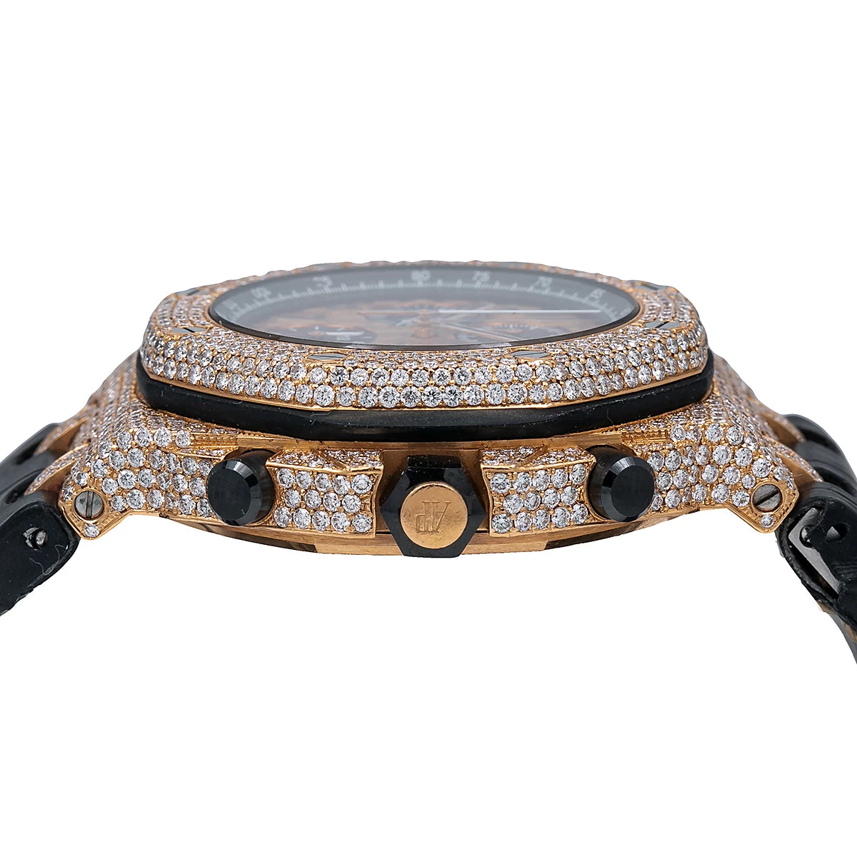 The Audemars Piguet Royal Oak Offshore Men’s Diamond Watch is a luxurious and stylish timepiece that is sure to turn heads. Crafted from 18K rose gold, this watch features a 44mm case with a bezel set with 8.75 carats of white diamonds. The brown dial is adorned with gold-tone hands and markers, and is protected by a scratch-resistant sapphire crystal. The watch is powered by an automatic movement and is water resistant up to 100 meters. The watch is completed with a black leather strap for a comfortable and secure fit.This watch is perfect for the man who appreciates luxury and style. The combination of rose gold and diamonds creates a stunning look that is sure to draw attention. The watch is also engravable, making it a great gift for a special occasion. With its timeless design and luxurious materials, the Audemars Piguet Royal Oak Offshore Men’s Diamond Watch is sure to become a treasured heirloom.