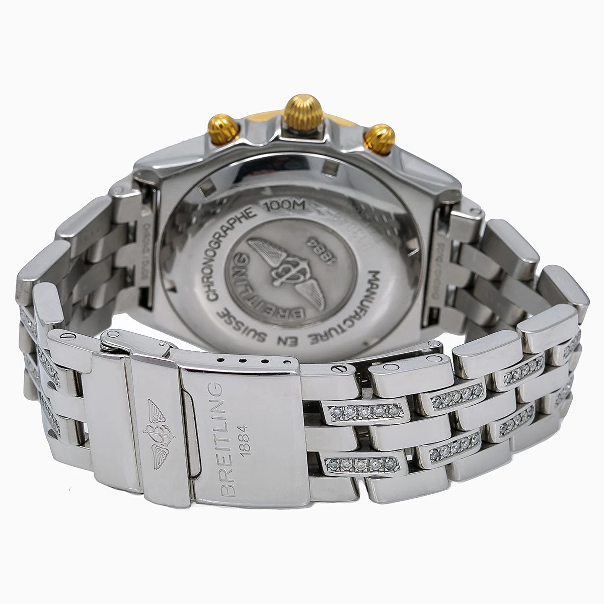 Introducing the Breitling Chronomat Evolution Men’s Diamond Watch. This luxurious timepiece features a 40mm case diameter. The bezel is also made from 18K yellow gold and is adorned with diamonds for a truly stunning look. The green dial is protected by a scratch-resistant sapphire crystal and is powered by an automatic movement. The watch is water-resistant up to 100 meters and comes with a 5-year warranty.The Breitling Chronomat Evolution Men’s Diamond Watch is the perfect accessory for any man who appreciates the finer things in life. The luxurious 18K yellow gold bezel is sure to turn heads, while the green dial and diamond accents add a touch of sophistication. The watch is powered by automatic movement and is water-resistant up to 100 meters, making it perfect for everyday wear. The 5-year warranty ensures that your timepiece will remain in perfect condition for years to come.The Breitling Chronomat Evolution Men’s Diamond Watch is the perfect addition to any man’s wardrobe. With its luxurious 18K yellow gold bezel, diamond accents, and green dial, this timepiece is sure to make a statement. The automatic movement and 10-meter water resistance make it perfect for everyday wear, while the 5-year warranty ensures that your timepiece will remain in perfect condition for years to come.