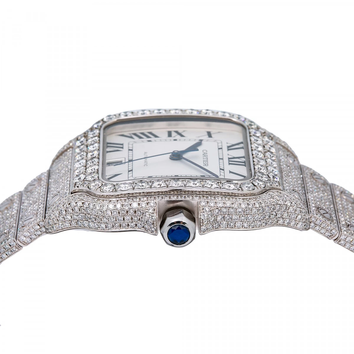 The Cartier Santos de Cartier 40mm White Dial Men’s Diamond Watch is a luxurious timepiece that is sure to add a touch of sophistication to any ensemble. This watch features a stainless steel case and bezel, with a white bezel stone set with 17.96 carats of diamonds. The white dial features a sapphire crystal, and is engraved with the Cartier logo. The stainless steel bracelet is also white, and is adjustable to fit any wrist size. The watch is powered by an automatic movement, and is water resistant up to 100 meters.This watch is perfect for the man who wants to make a statement. The diamonds add a touch of sparkle and glamour, while the stainless steel and white color scheme keeps the look classic and timeless. The engraving on the dial adds a personal touch, and the adjustable bracelet ensures a perfect fit. This watch is sure to be a treasured piece for years to come.
