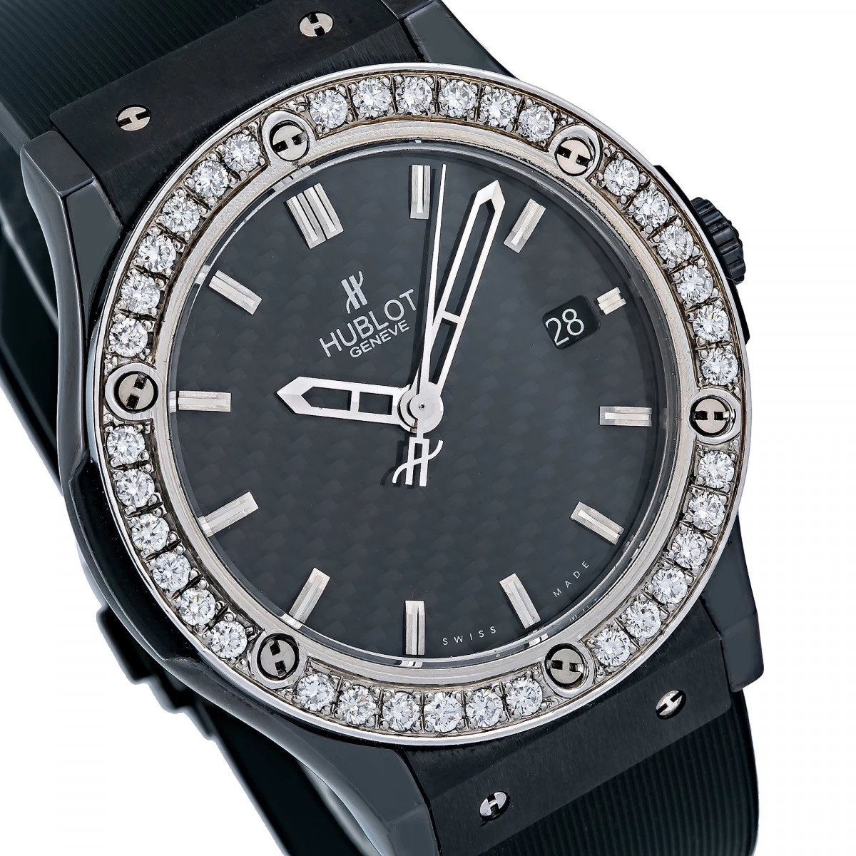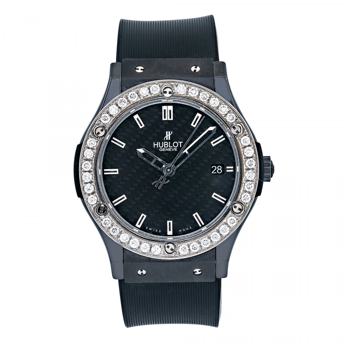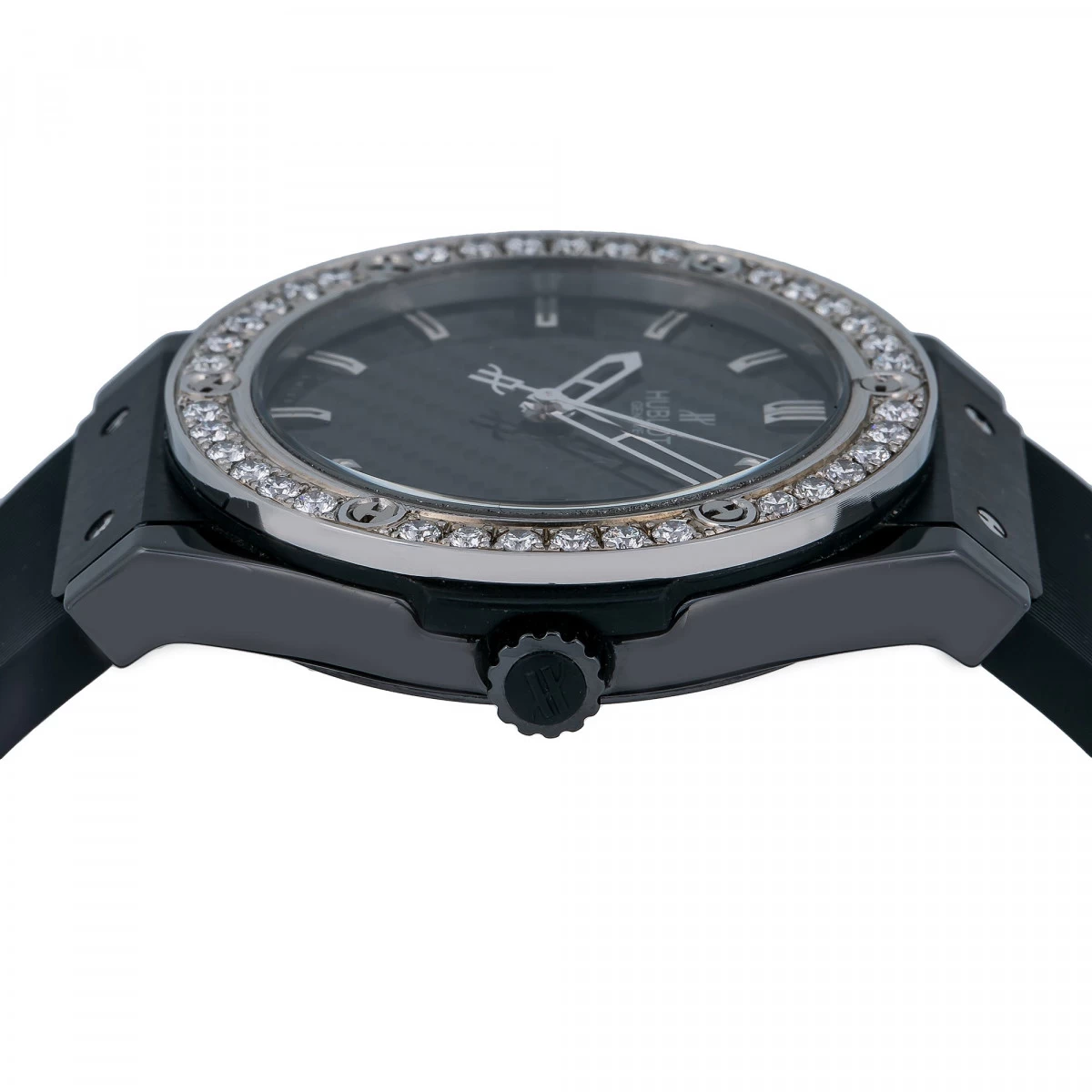 Introducing the Hublot Classic Fusion 45mm Black Dial W01045 Men’s Diamond Watch. This luxurious timepiece is crafted from stainless steel and features a bezel set with diamonds and a black rubber bracelet. The case diameter is 45mm and the crystal is a scratch-resistant sapphire. The black dial is engraved with the Hublot logo and features three chronograph sub-dials and a date window at the 6 o’clock position. The watch is powered by an automatic movement and is water-resistant up to 50 meters.The Hublot Classic Fusion 45mm Black Dial W01045 Men’s Diamond Watch is the perfect accessory for any man who appreciates the finer things in life. The stainless steel case and bezel are polished to a high shine and the diamonds add a touch of sparkle and sophistication. The black rubber bracelet is comfortable to wear and the watch is powered by an automatic movement, so you never have to worry about winding it. The watch is also water-resistant up to 50 meters, so you can wear it while swimming or showering without fear of damage.The Hublot Classic Fusion 45mm Black Dial W01045 Men’s Diamond Watch is a timeless piece that will never go out of style. With its classic design and luxurious materials, the Hublot Classic Fusion 45mm Black Dial W01045 Men’s Diamond Watch is sure to become a treasured heirloom.