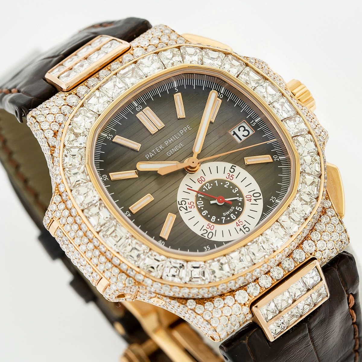 The Patek Philippe Nautilus 40.5mm Men’s Diamond Watch is a luxurious and timeless timepiece. Crafted from 18K rose gold, this watch features a bezel set with 14.5 carats of sparkling white diamonds. The case is 40.5mm in diameter and is protected by a scratch-resistant sapphire crystal. The brown leather bracelet is comfortable and stylish, and the watch is water resistant up to 120 meters. The watch is engraved with the Patek Philippe logo, and comes with a 5-year warranty.This watch is perfect for any special occasion, from a night out on the town to a formal event. The diamonds add a touch of elegance and sophistication, while the rose gold adds a hint of warmth. The watch is sure to make a statement and will be a treasured piece for years to come. The Patek Philippe Nautilus 40.5mm Men’s Diamond Watch is a timeless classic that will never go out of style.