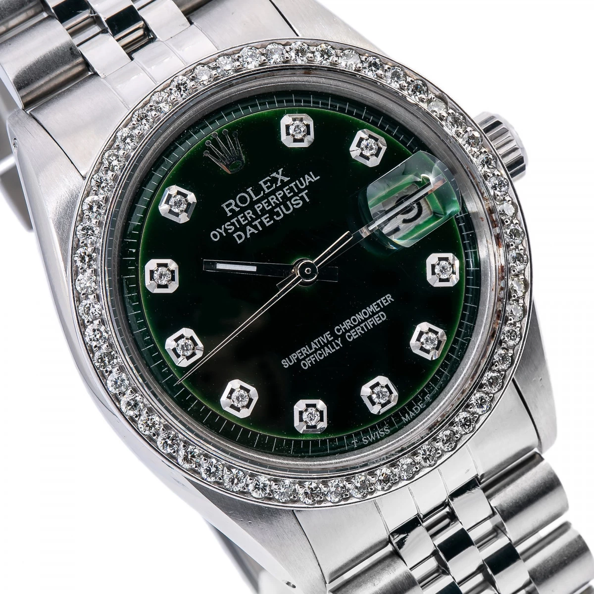 The Rolex Datejust 36mm Jubilee Bracelet Green Dial is a luxurious and stylish timepiece for men. This watch features a stainless steel case and bezel, set with diamonds for a sparkling effect. The bezel stones are white in color, and the bracelet is a stainless steel Jubilee style. The dial is a beautiful green color, and is set with diamonds for a luxurious look. The crystal is a scratch-resistant sapphire, and the movement is an automatic one. The watch is engravable, and comes with a 5 year seller’s warranty.This watch is perfect for any man who wants to make a statement. It is a timeless piece that will never go out of style. The stainless steel case and bezel are durable and will last for years to come. The diamonds add a touch of sparkle and glamour, while the green dial adds a touch of sophistication. The Jubilee style bracelet is comfortable and secure, and the scratch-resistant sapphire crystal ensures that the watch will stay looking like new.With its 5 year seller’s warranty, this watch is sure to be a treasured piece for years to come.