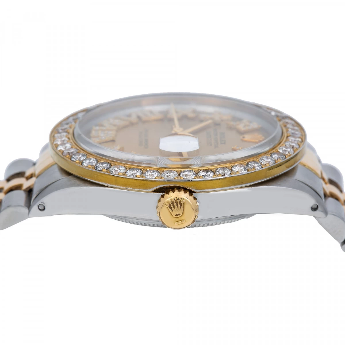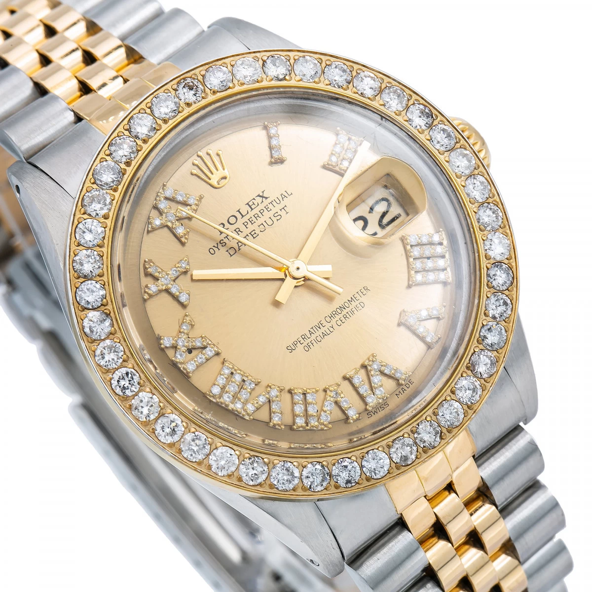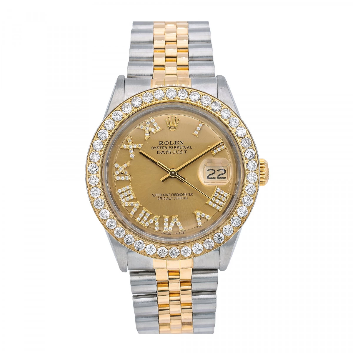 The Rolex Datejust 36mm Men’s Diamond Watch is a luxurious timepiece that is sure to make a statement. This watch features a yellow gold bezel set with sparkling white diamonds, a champagne dial with diamond markers, and a yellow gold and stainless steel Jubilee bracelet. The case is 36mm in diameter and is crafted from yellow gold and stainless steel. The watch is powered by an automatic movement.The Rolex Datejust 36mm Men’s Diamond Watch is a timeless classic that will never go out of style. The champagne dial is adorned with diamond markers and Roman numerals, making it a truly elegant timepiece. The yellow gold bezel is set with sparkling white diamonds, adding a touch of luxury to the watch. The yellow gold and stainless steel Jubilee bracelet is comfortable and secure, making it perfect for everyday wear.This watch is perfect for any occasion and is sure to be a treasured heirloom for generations to come. The watch is backed by a 5 year seller’s warranty, so you can be sure that your timepiece will last for years to come.