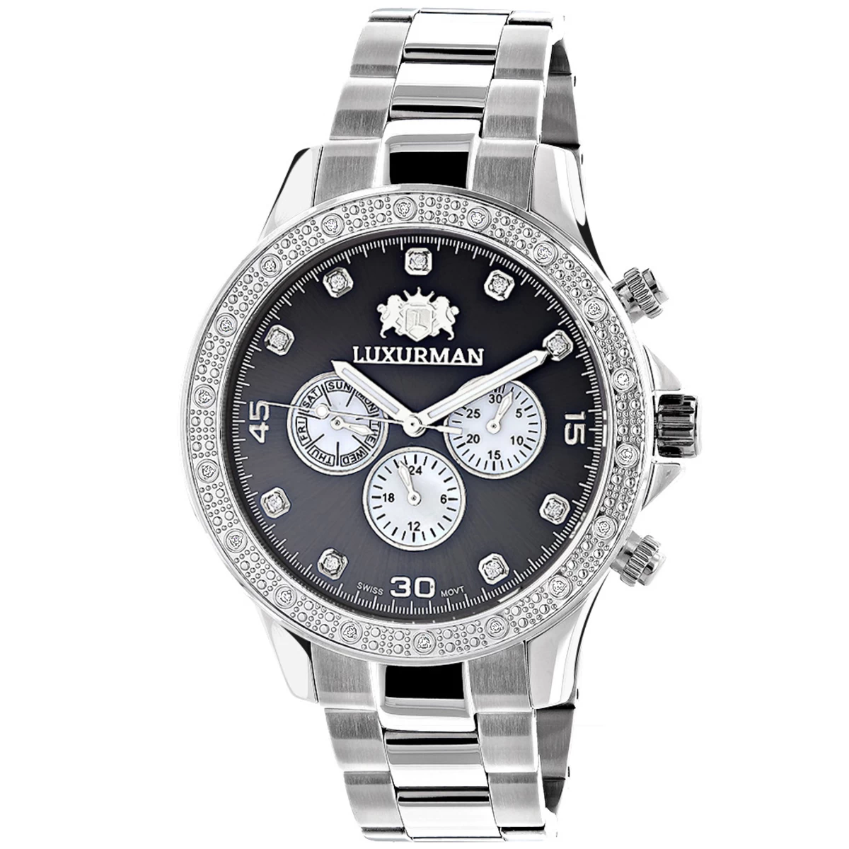 Designer watches: this Men’s Diamond Watch by Luxurman Liberty features a fine Swiss movement and 0.2 carats of sparkling round diamonds. This diamond watch for men showcases a black dial with Date/Calendar/24 hours white mother of pearl subdials, and a silver tone stainless steel band and case. This diamond watch by Luxurman comes in full retail packaging with two extra interchangeable straps in different colors and quality made, backed by 5 year factory warranty. This Luxurman Diamond watch makes a perfect present for any occasion.