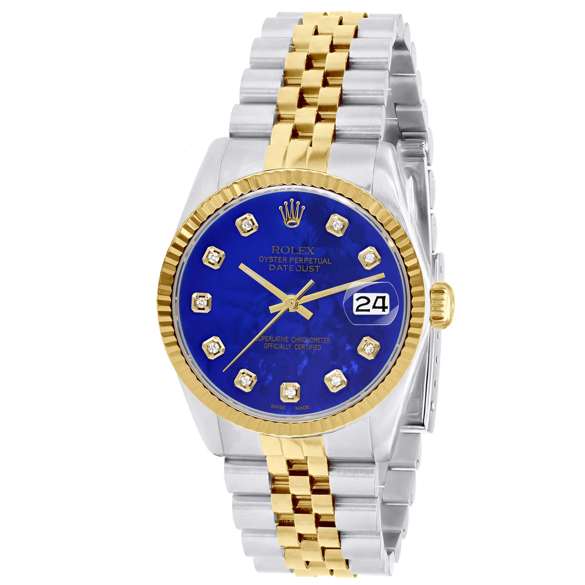 Men’s Diamond Watch Watch Rolex Datejust 36mm Dark Blue Mother Of Pearl Dial Jubilee Bracelet. This Diamond Watch Rolex watch is pre-owned, in excellent condition, and comes in a Rolex box with a full warranty from ItsHot. Customize the look of the watch if you prefer with Diamond Watch bezel or fluted bezel. Each watch can be additionally customized with Diamond Watchs on the case as well as band (please contact us for details).
