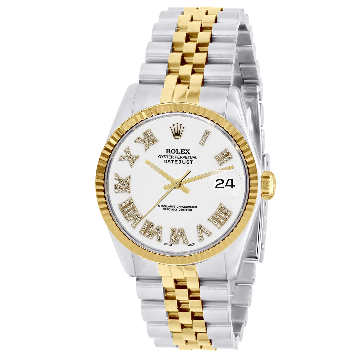 Men’s Diamond Watch Watch Rolex Datejust 36mm Milky White Roman Numerals Dial Jubilee Bracelet Gold Bezel. This Diamond Watch Rolex watch is pre-owned, in excellent condition, and comes in a Rolex box with a full warranty from ItsHot. Customize the look of the watch if you prefer with Diamond Watch bezel or fluted bezel. Each watch can be additionally customized with Diamond Watchs on the case as well as band (please contact us for details).