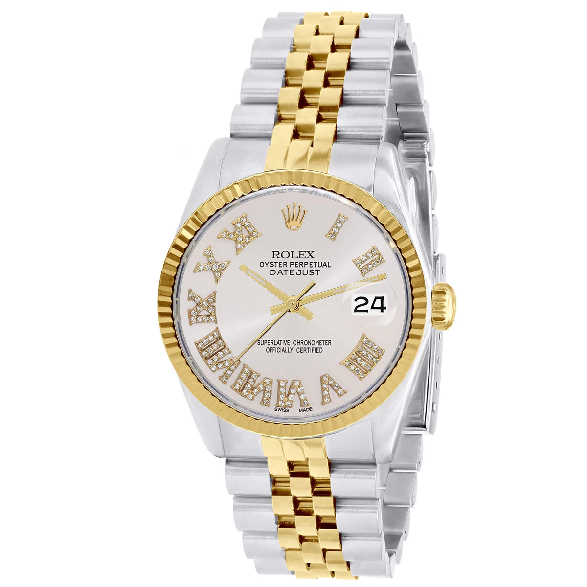 Men’s Diamond Watch Watch Rolex Datejust 36mm Smokey White Roman Numerals Dial Jubilee Bracelet. This Diamond Watch Rolex watch is pre-owned, in excellent condition, and comes in a Rolex box with a full warranty from ItsHot. Customize the look of the watch if you prefer with Diamond Watch bezel or fluted bezel. Each watch can be additionally customized with Diamond Watchs on the case as well as band (please contact us for details).